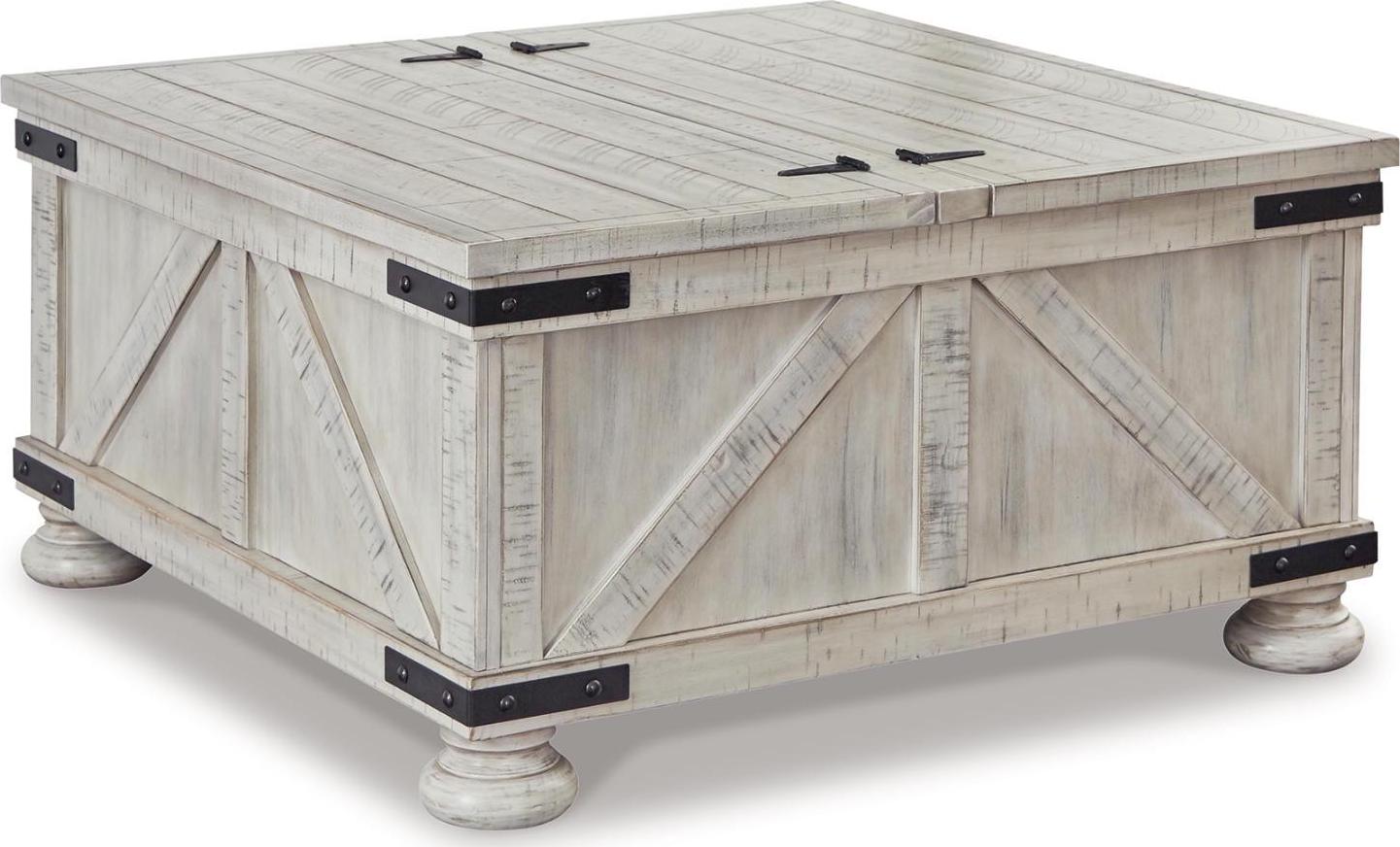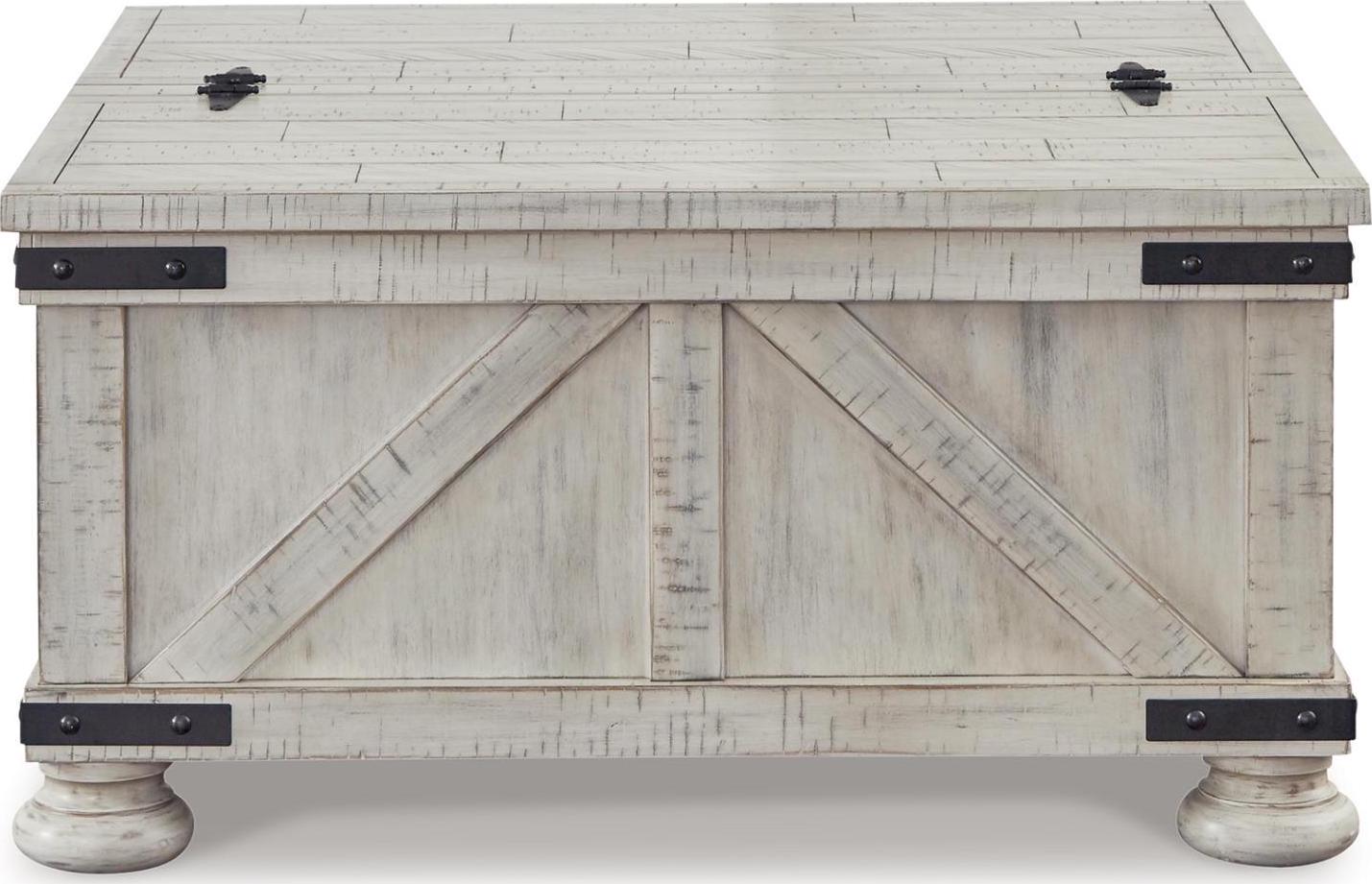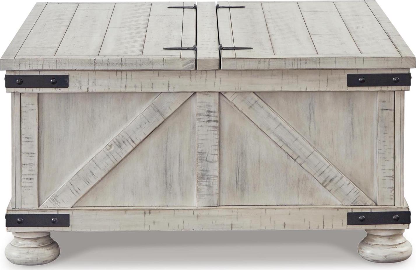 Double up on form and function with the Carynhurst square coffee table with storage. Its dual-lid tabletop provides easy access to the roomy storage space. Crafted with a distressed whitewash finish, crossbuck detailing and metal bracket appliques, this generously scaled coffee table is rustic farmhouse living at its best.