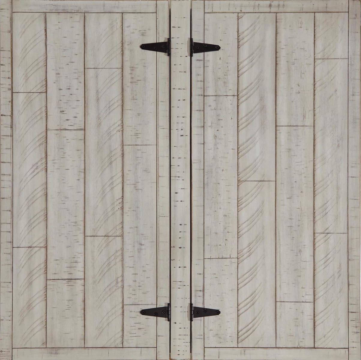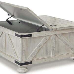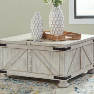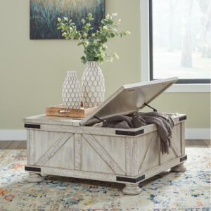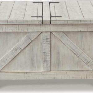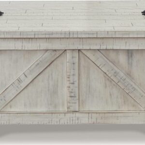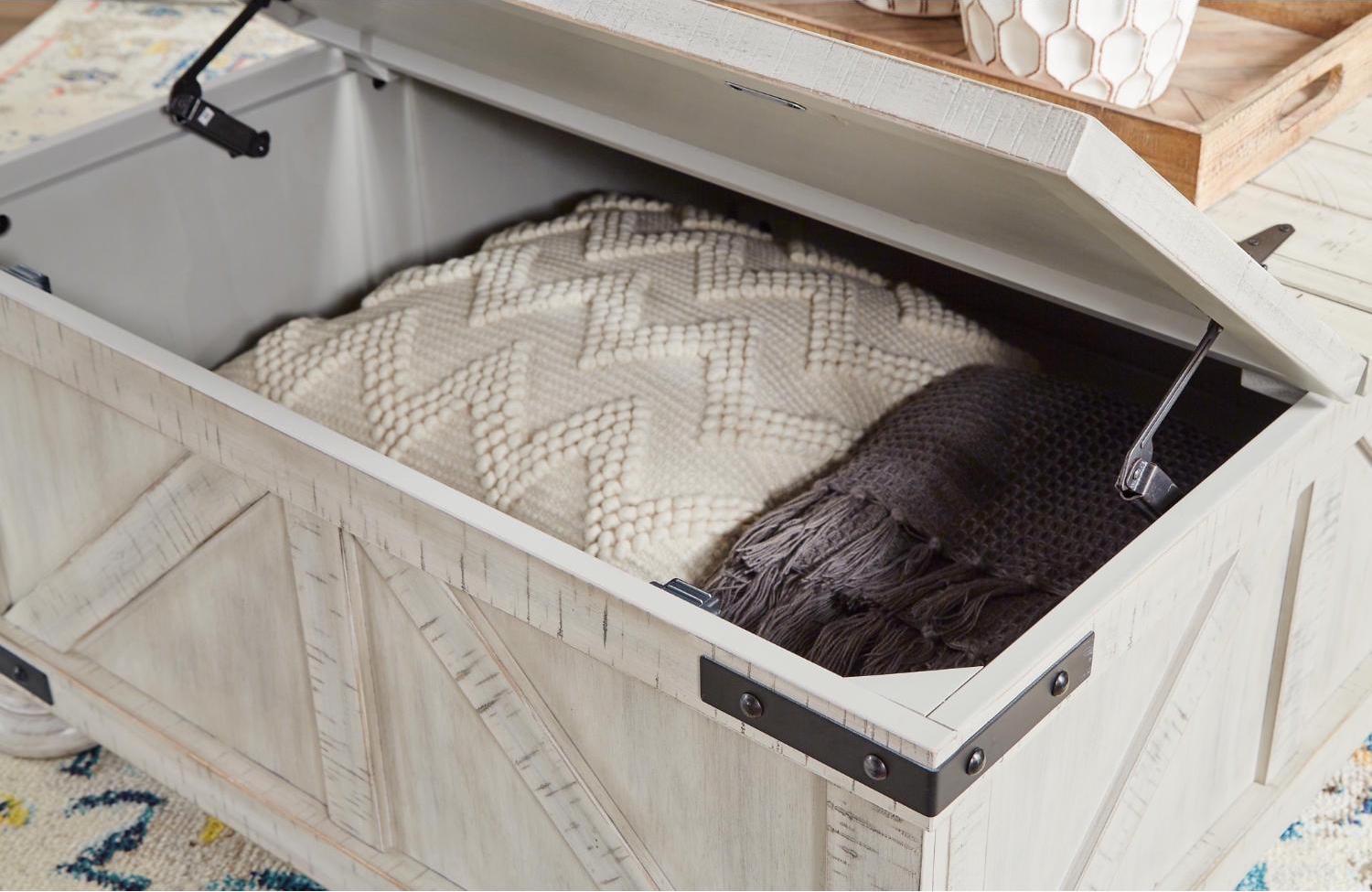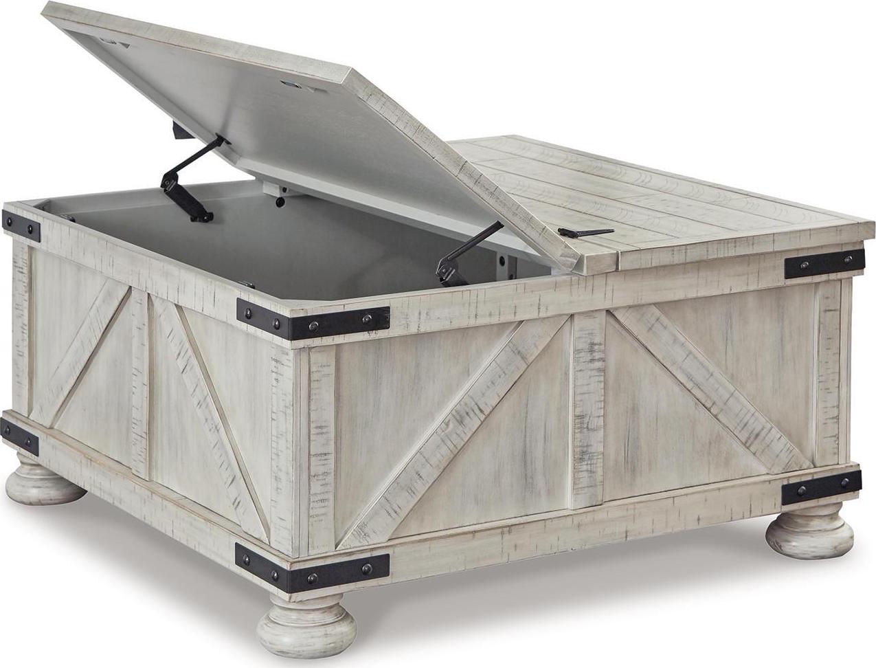 Double up on form and function with the Carynhurst square coffee table with storage. Its dual-lid tabletop provides easy access to the roomy storage space. Crafted with a distressed whitewash finish, crossbuck detailing and metal bracket appliques, this generously scaled coffee table is rustic farmhouse living at its best.