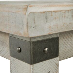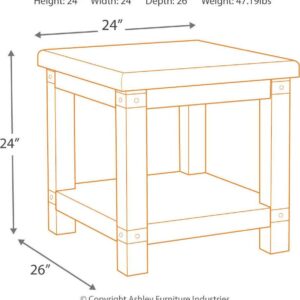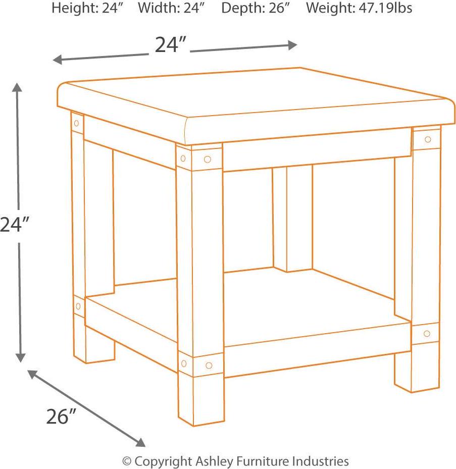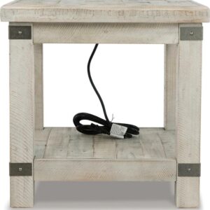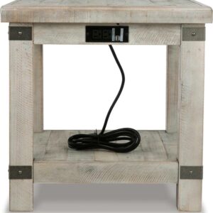 Add a quaint touch of farmhouse style to your living area with the Carynhurst end table. Its beautifully distressed light gray finish enhances the wood’s natural grain, which delivers a naturally aged feel straight from the countryside. You’ll love its generous scale, offering a roomy table top and base shelf that are ideal for displaying accents and more. Large legs, metal accents and the planked effect dress up its country charm.