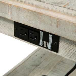 Made of reclaimed solid pine wood,Light gray wash finish,Planked and butcher block wood effect,Metal bracket accents,2 electrical outlets and 2 USB charging ports