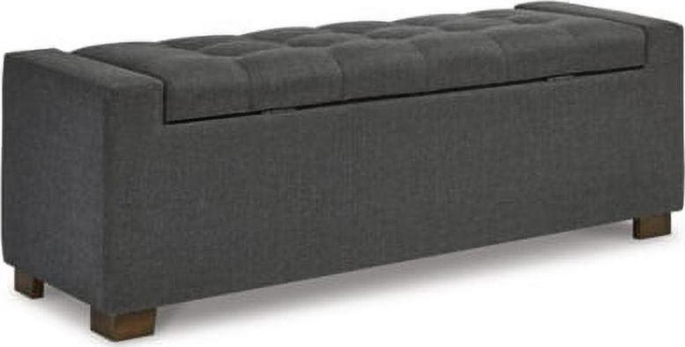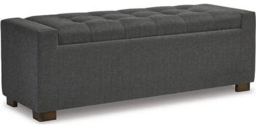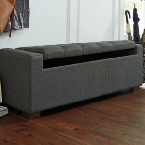 Whether gracing a front entry or living room, or placed at the foot of the bed, the Cortwell upholstered storage bench is loaded with flair. Tufted cushioned seat with hinge reveals an ample storage compartment for this, that and the other. Gorgeous gray fabric is the epitome of neutral sophistication.