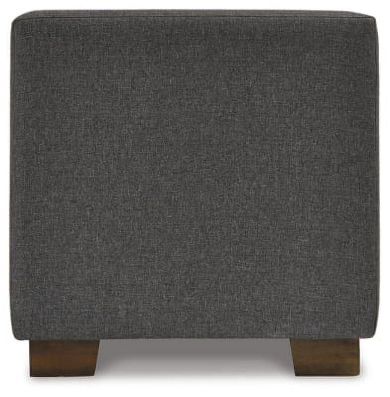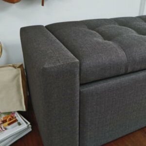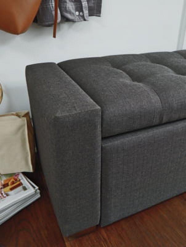 Polyester upholstery in gray,Wood legs with brown finish,Tufted seat cushion,Hinged seat,Interior storage