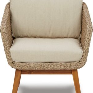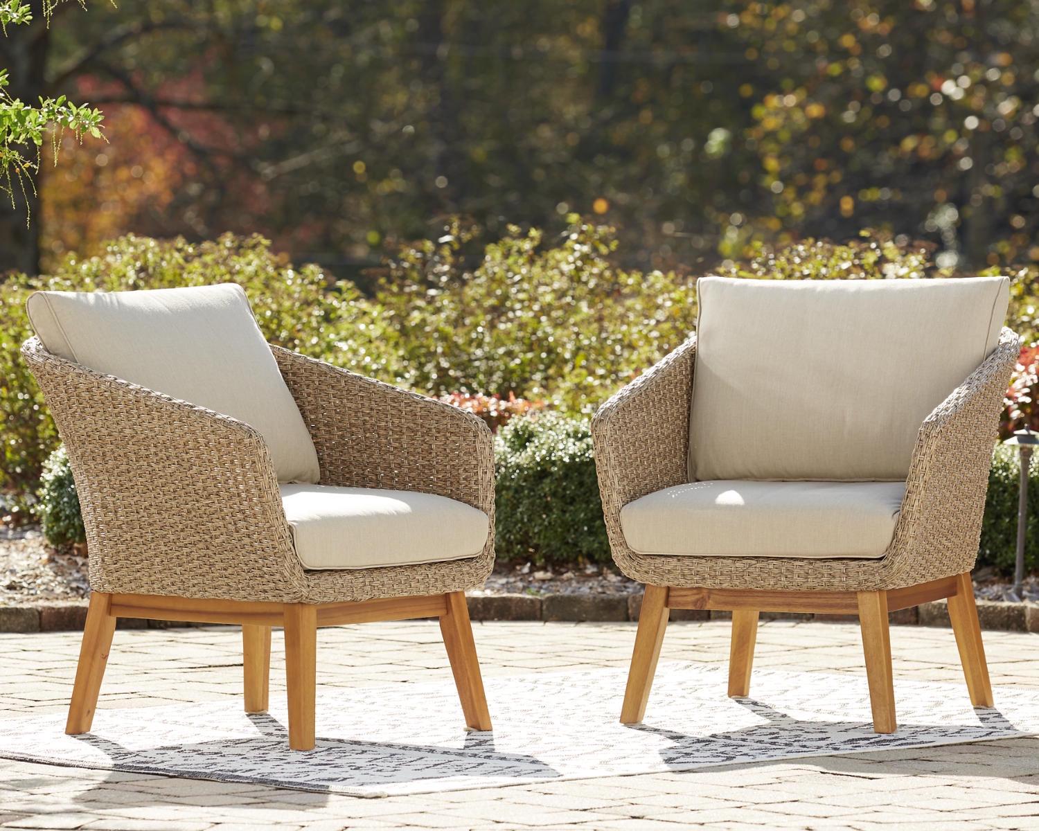 Set of 2,Made of resin wicker woven over aluminum frames,Acacia wood legs,Cushions covered in solution-dyed Nuvella (olefin) high-performance fabric,All-weather foam cushion core wrapped in soft polyester