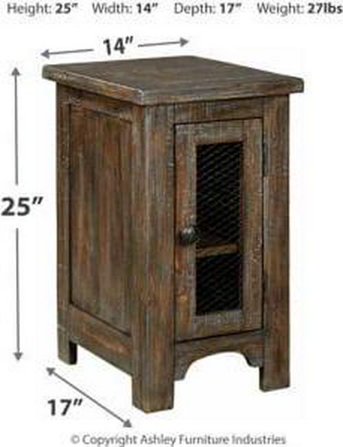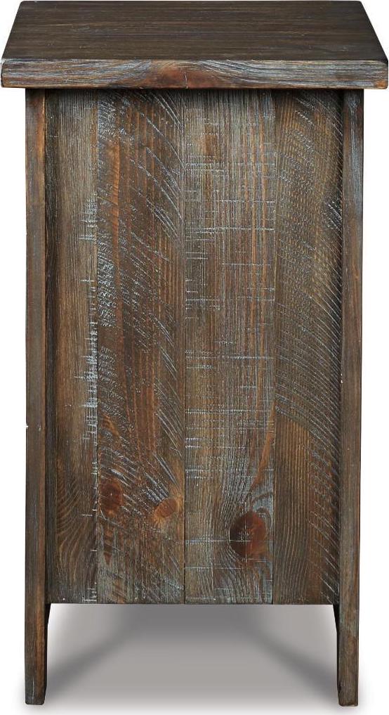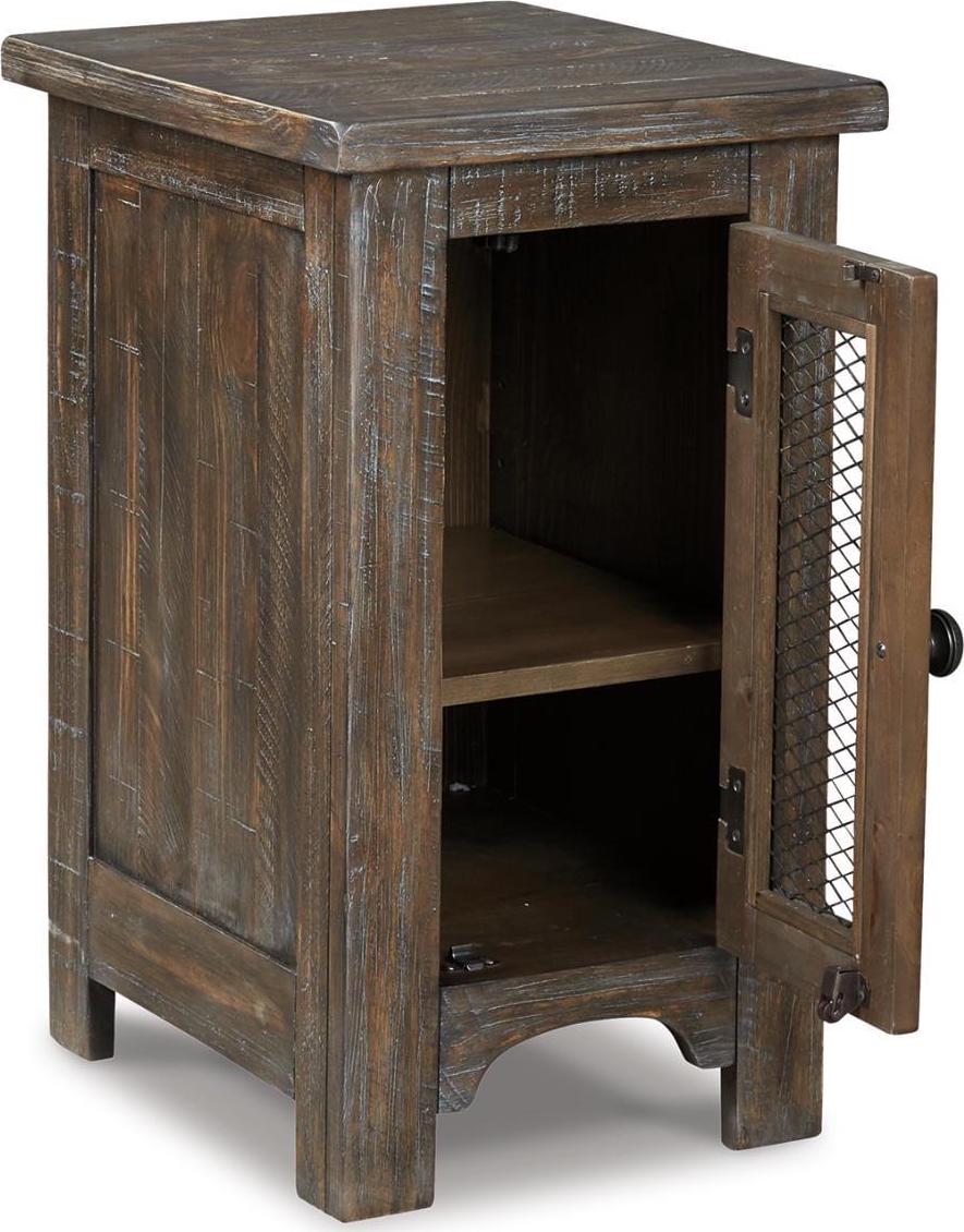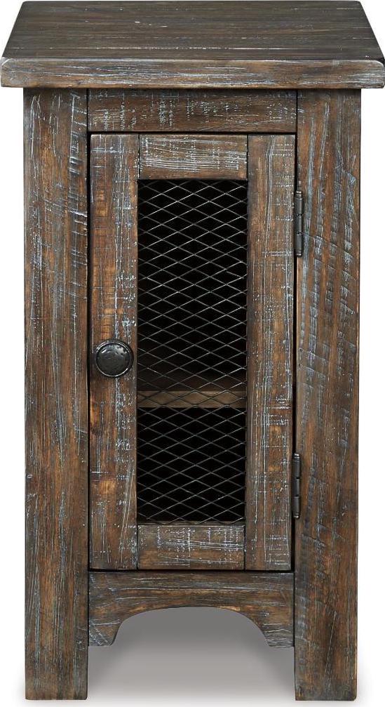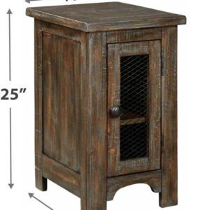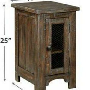 The Danell Ridge chairside end table is so much better for the wear. Its clean, straightforward profile is enriched with solid pine wood treated to a complex finish melding gray and brown hues. Cabinet door with wire mesh front infuses a farmhouse fresh element that s right on trend. Talk about loaded with charm and packed with possibilities.
