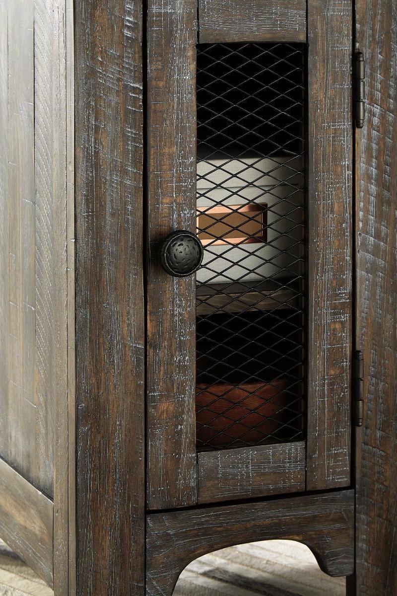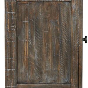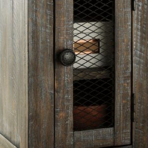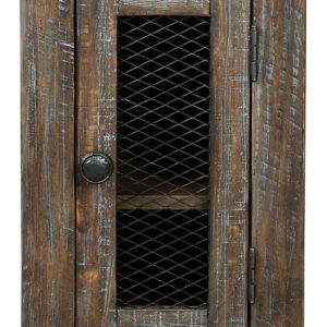 Made of veneers, pine wood and engineered wood,Distressed finish with light wire-brushed texture,Cabinet door with inset wire mesh revealing single-shelf storage,Dark iron-tone hardware,Assembly required