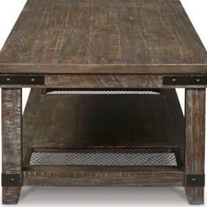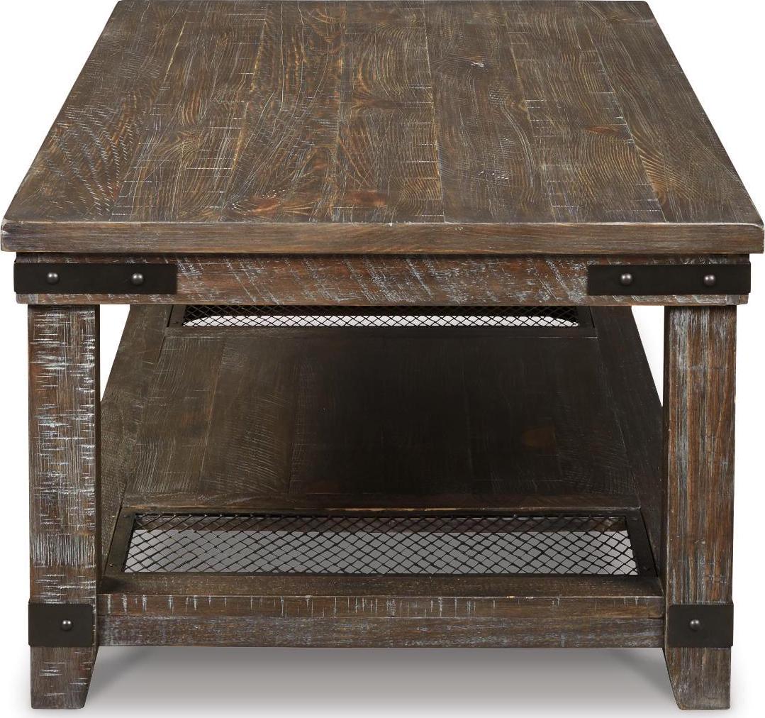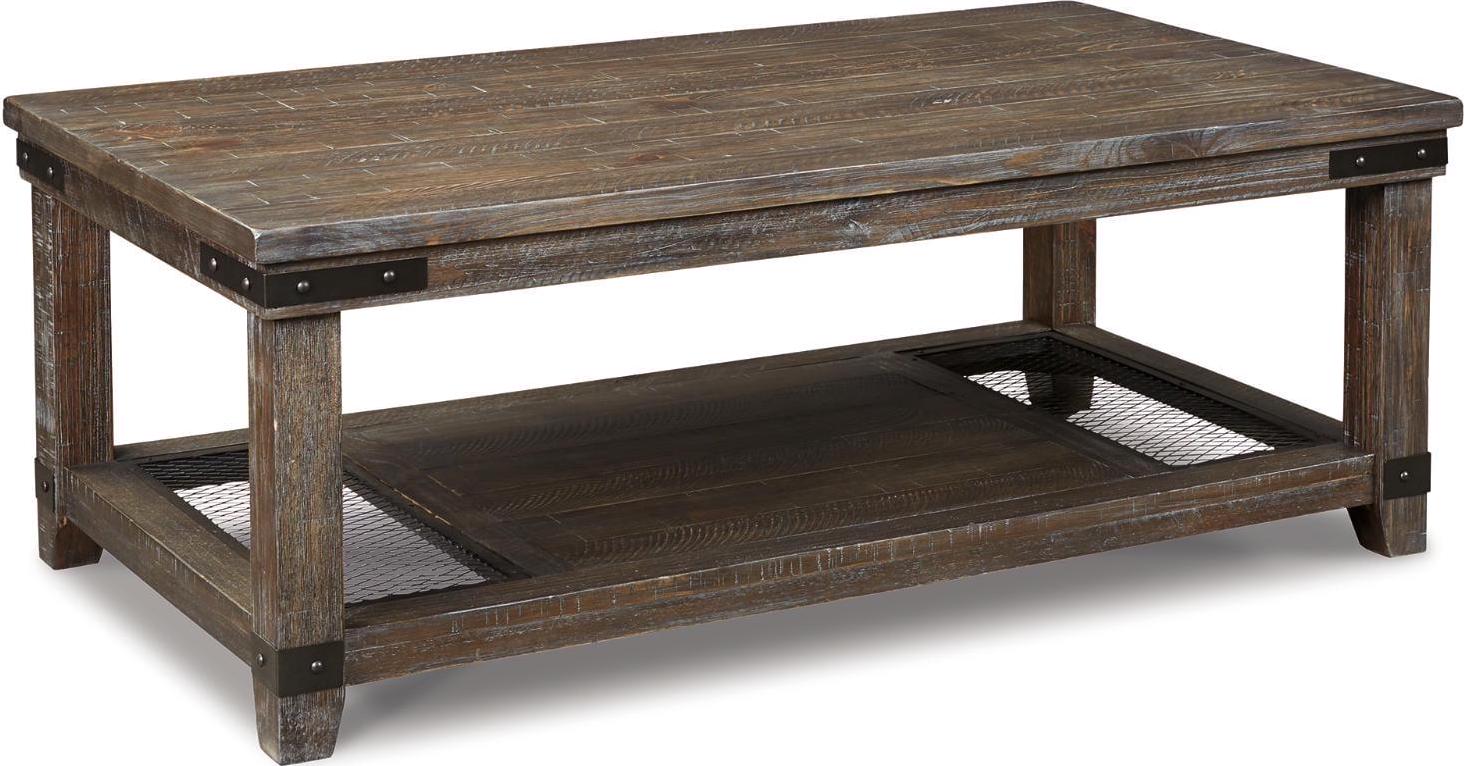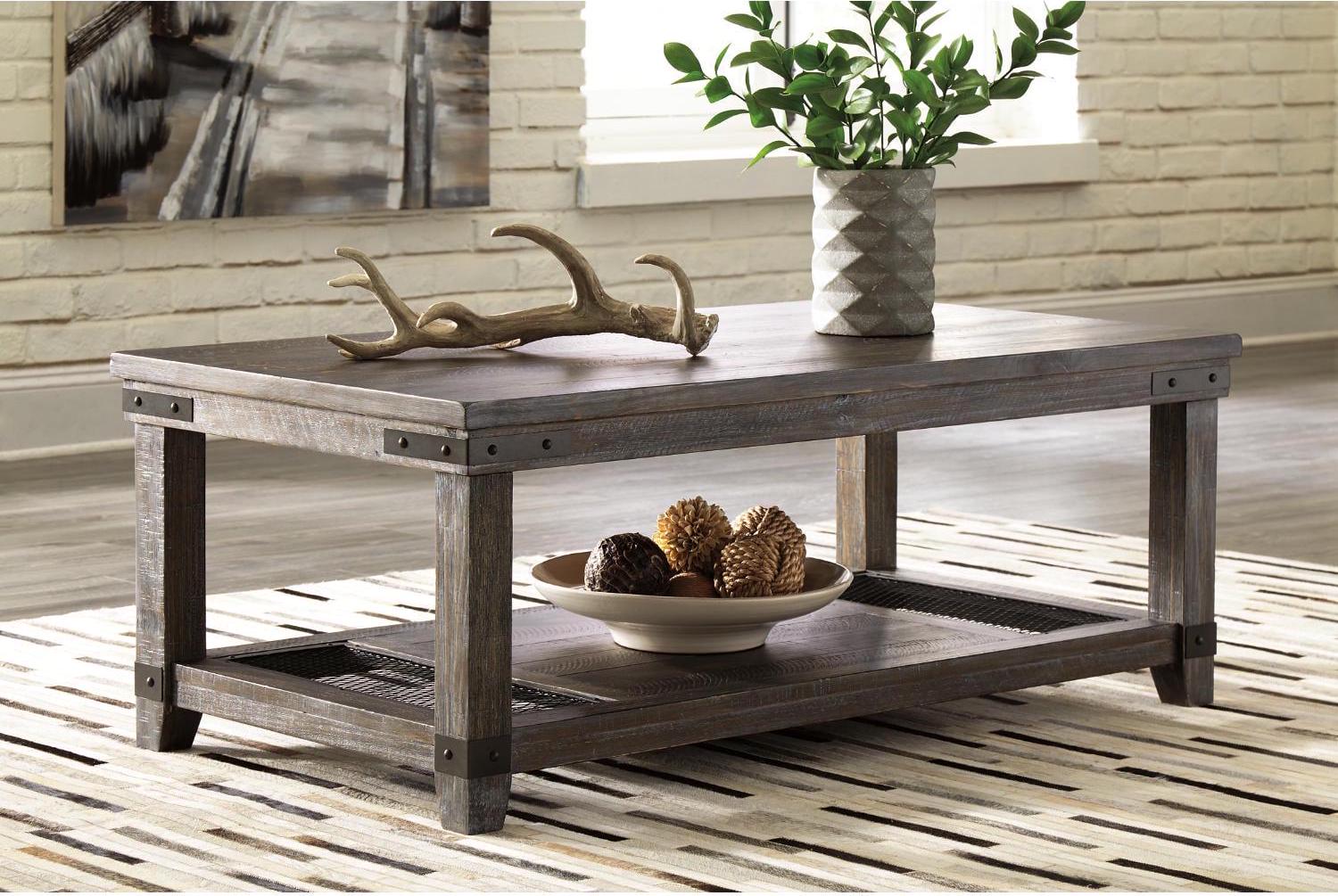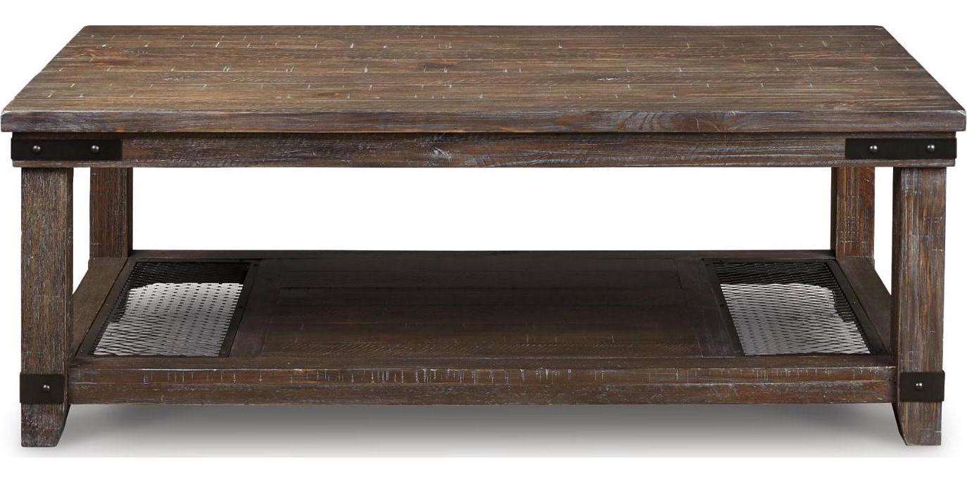 The Danell Ridge coffee table is so much better for the wear. Its clean, straightforward profile is enriched with solid pine wood treated to a complex finish melding gray and brown hues. Sporting iron-tone industrial brackets and a distinctive display shelf, it s loaded with charm and packed with possibilities.