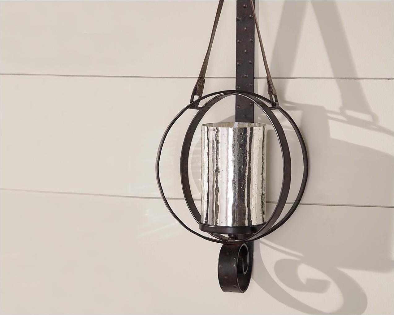 Love a rustically refined sense of style You re sure to be hooked on the one-of-a-kind Despina wall sconce. Luminous mercury glass hurricane lamp is encircled by hammered metal rings and secured by a strapping leather strap and metal wall brace.