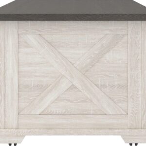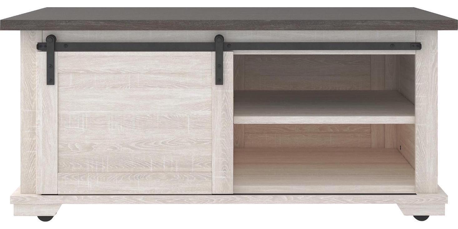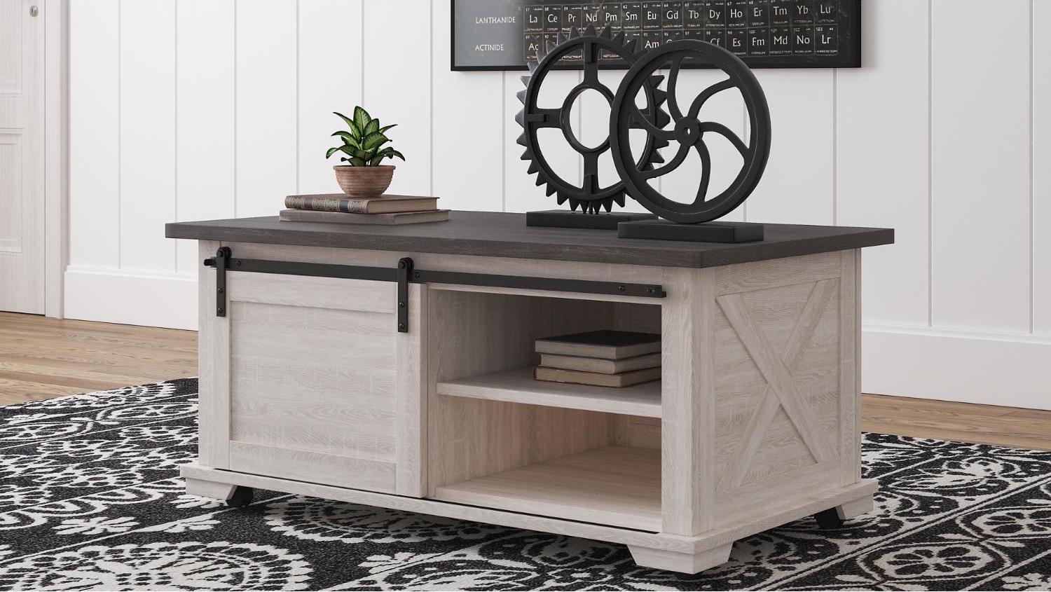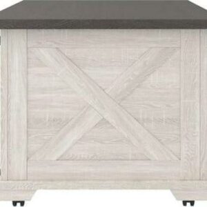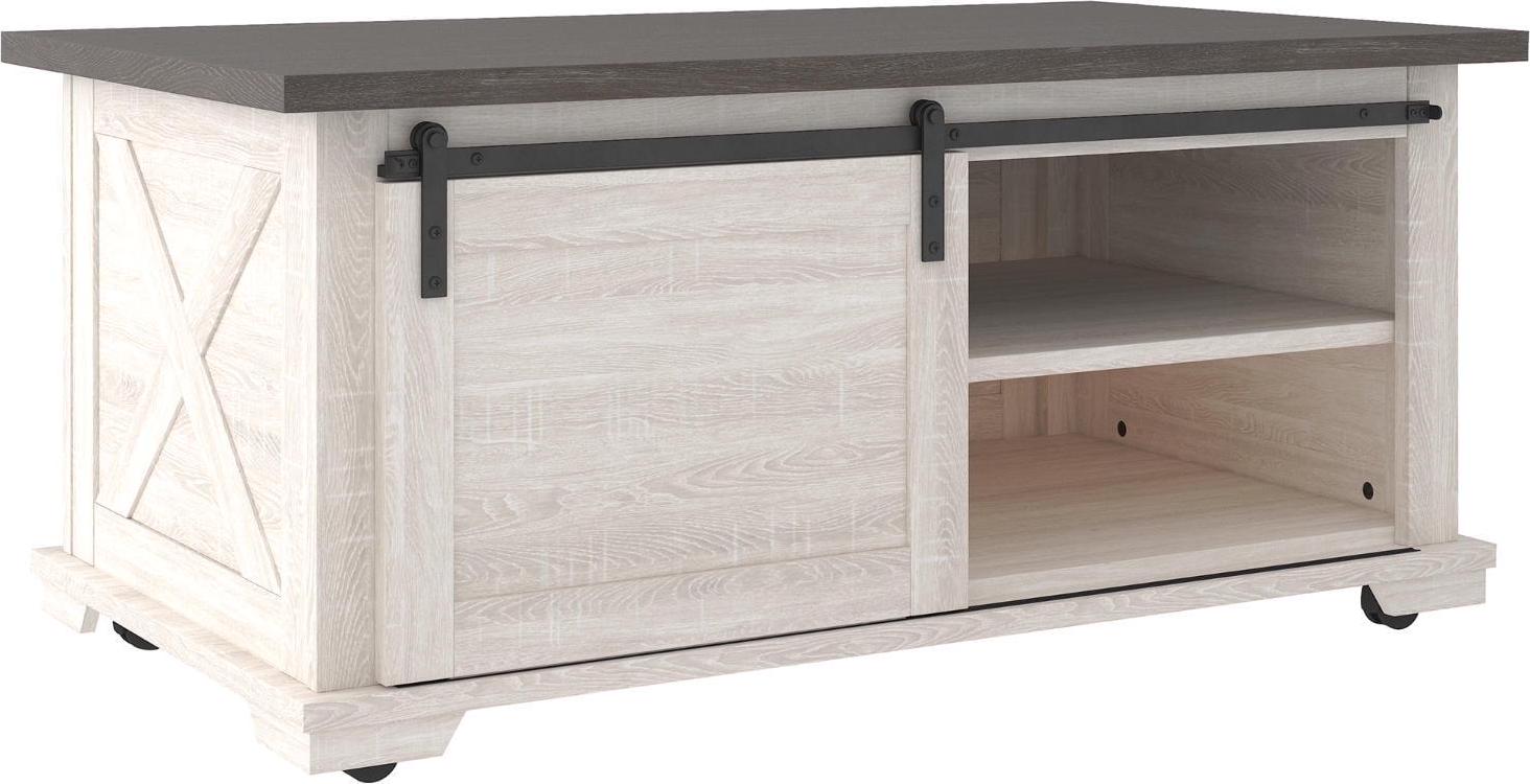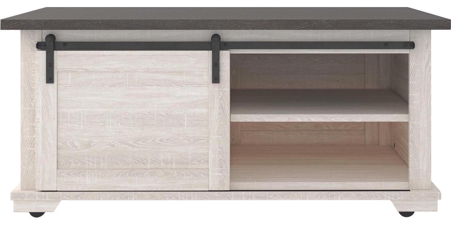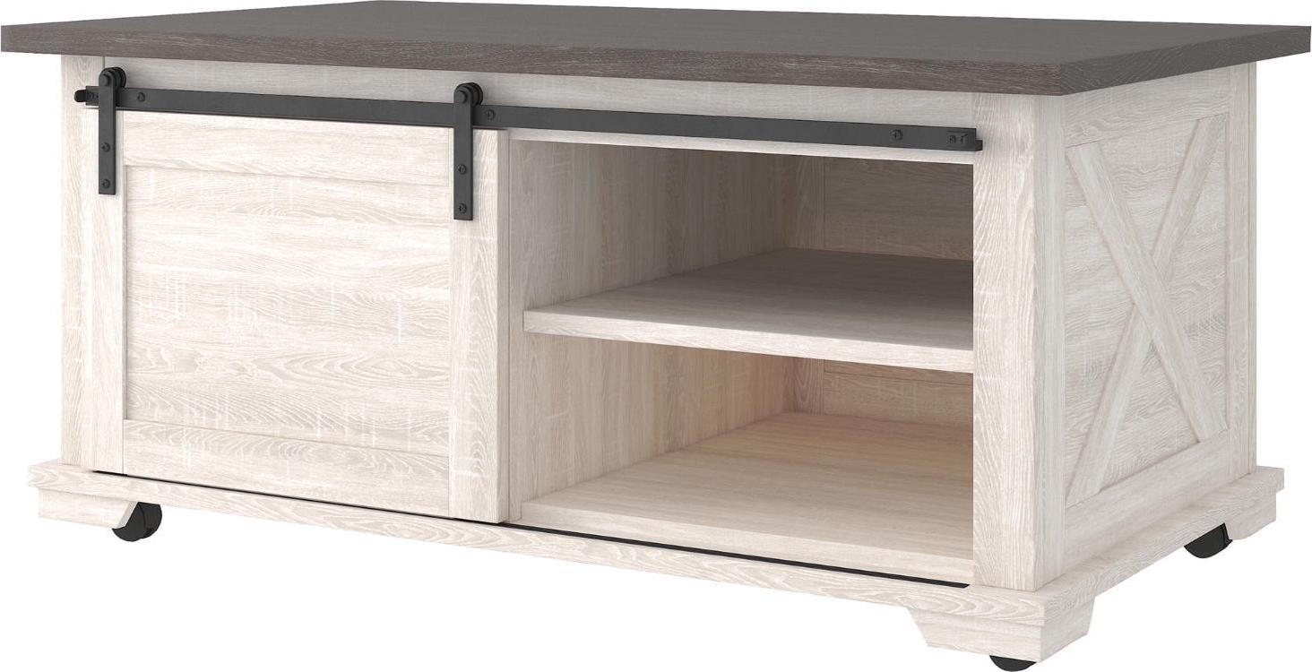 Raise the bar on modern farmhouse design with the Dorrinson coffee table. Sporting a two-tone, gray and antiqued white color scheme and cross buck design, the table’s unique sliding barn door” moves to reveal shelved storage space. Easy roll casters add a cool touch that’s right on trend.”