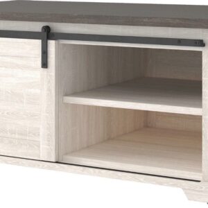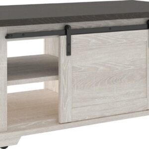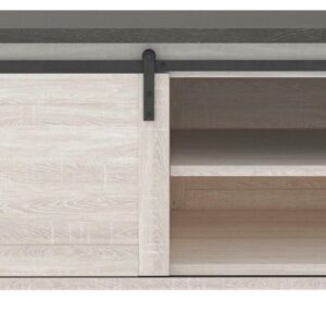 Made of decorative laminate over engineered wood with two-tone, gray and antiqued white color scheme,Barn door slides to reveal open, shelved storage,Casters for easy mobility,Assembly required,ASSEMBLY REQUIRED: Easy-to-follow instructions, tools and hardware included