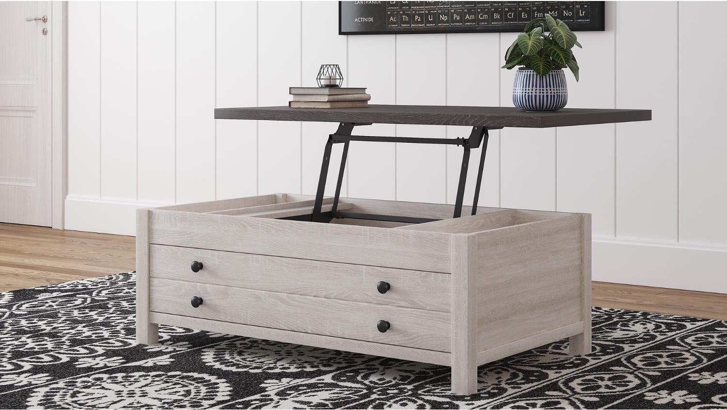 Raise the bar on modern farmhouse design with the Dorrinson lift top coffee table. Sporting a two-tone, gray and antiqued white color scheme and cross buck design, this table’s handy spring-loaded mechanism brings the tabletop closer to you. This versatile table makes it easier than ever to eat, work or play from the comfort of your sofa.