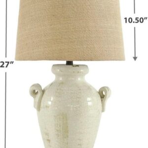 Emelda table lamp illuminates with vintage-inspired style. Antiqued cream glazed ceramic base boasts a crackle effect. Vase shape with the appearance of handles sits beautifully on end table. Perfect for farmhouse and cottage chic spaces.