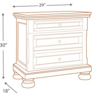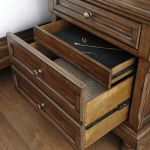 Made of wood, engineered wood and veneers,Aged brass-tone knob hardware,2 smooth-gliding drawers with dovetail construction (pull-out tray and top drawer felt lined),Small Space Solution,MINOR ASSEMBLY: Simply screw in feet and tipping restraint with included tools, hardware and instructions, and it’s ready to enjoy. Matching bedroom set available, sold separately