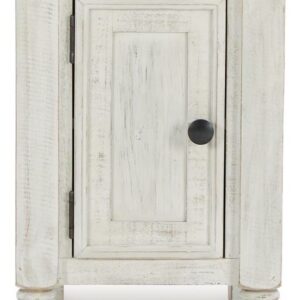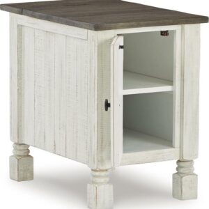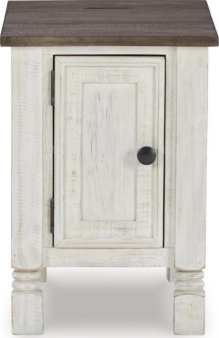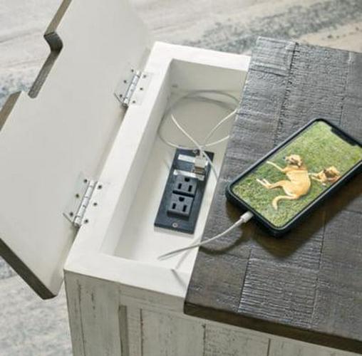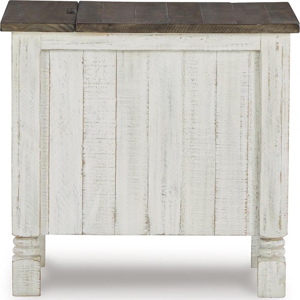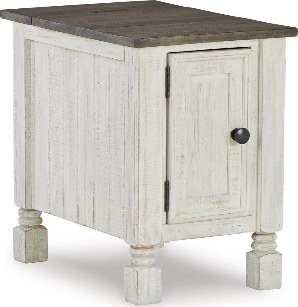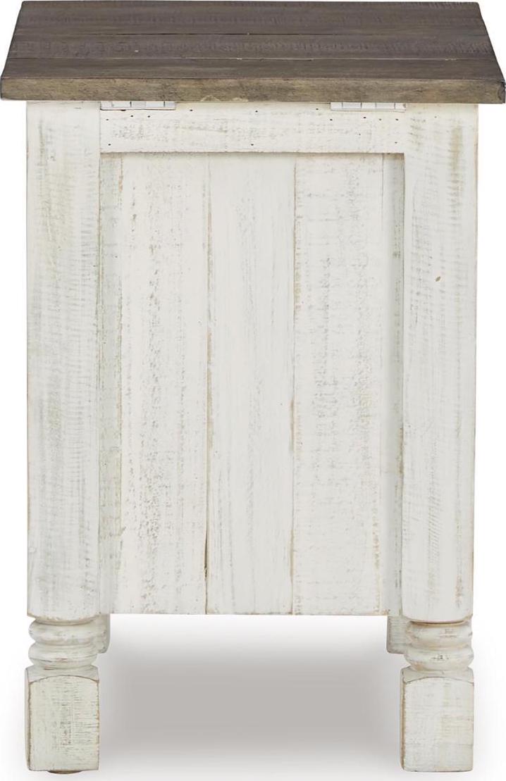 What a fresh interpretation of country classic style. Inspired by American farmhouse craftsmanship, but with an elevated sensibility, the Havalance chairside end table blends distinctive details such as turned post accents and raised door fronts for a substantial look that feels right at home. Those who appreciate rustic character should take note of the table s thick crown moulding, beautified with a vintage two-tone finish. A small flip lid located on the top conceals a power outlet and USB ports to keep electronics charged up and close at hand.