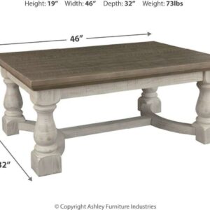 With its richly rustic finish and textural mix, the Havalance coffee table goes to town on bygone beauty. Its distressed two-tone treatment blends a weathered gray with vintage white for an utterly charming effect. Robust legs lend a hearty, substantial look that feels right at home.