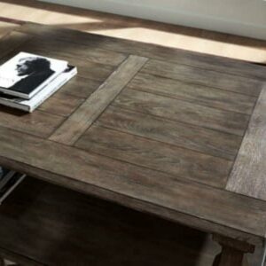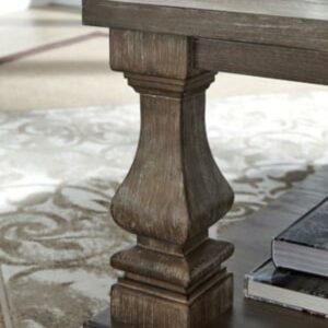 Homey. Hearty. Heavenly hued. Luring with a distressed weathered gray finish and square baluster legs set on a broad lower shelf for great presence, the Johnelle coffee table is sure to make your homestead feel that much more like home. The look is beautified with elm veneers and a framed and plank-effect tabletop for a richly crafted masterpiece made for years of satisfaction.