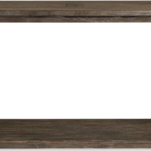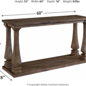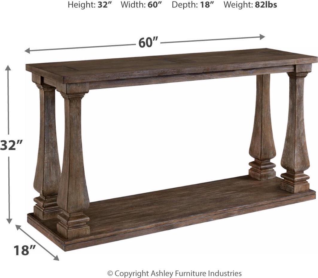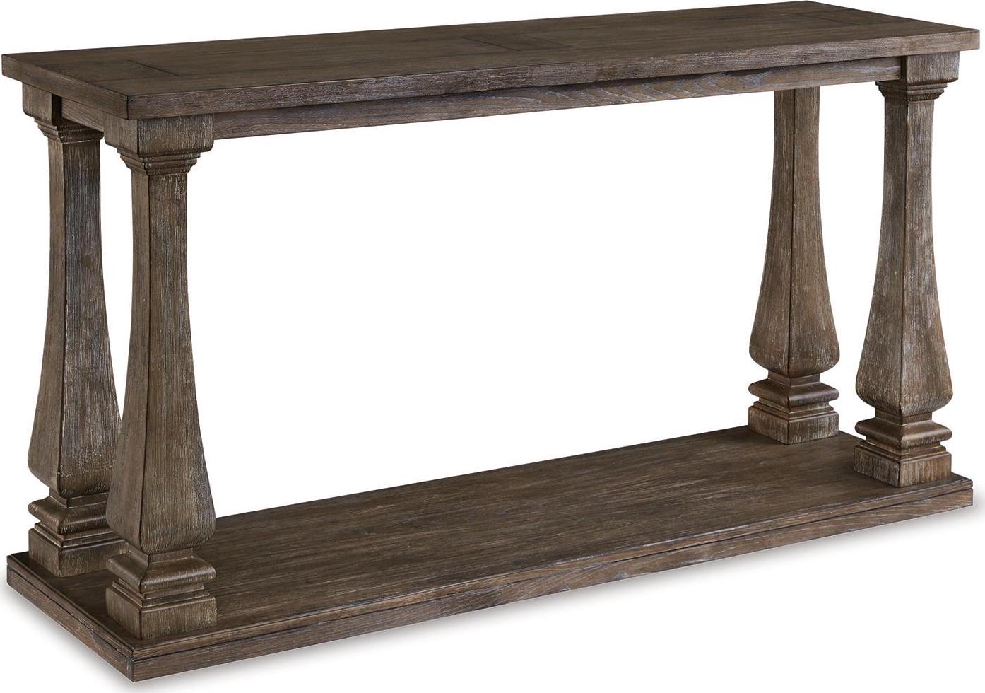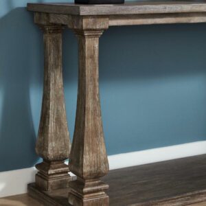 Homey. Hearty. Heavenly hued. Luring with a distressed weathered gray finish and square baluster legs set on a broad lower shelf for great presence, the Johnelle sofa table is sure to make your homestead feel that much more like home. The look is beautified with elm veneers and a framed and plank-effect tabletop for a richly crafted masterpiece made for years of satisfaction.