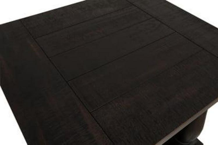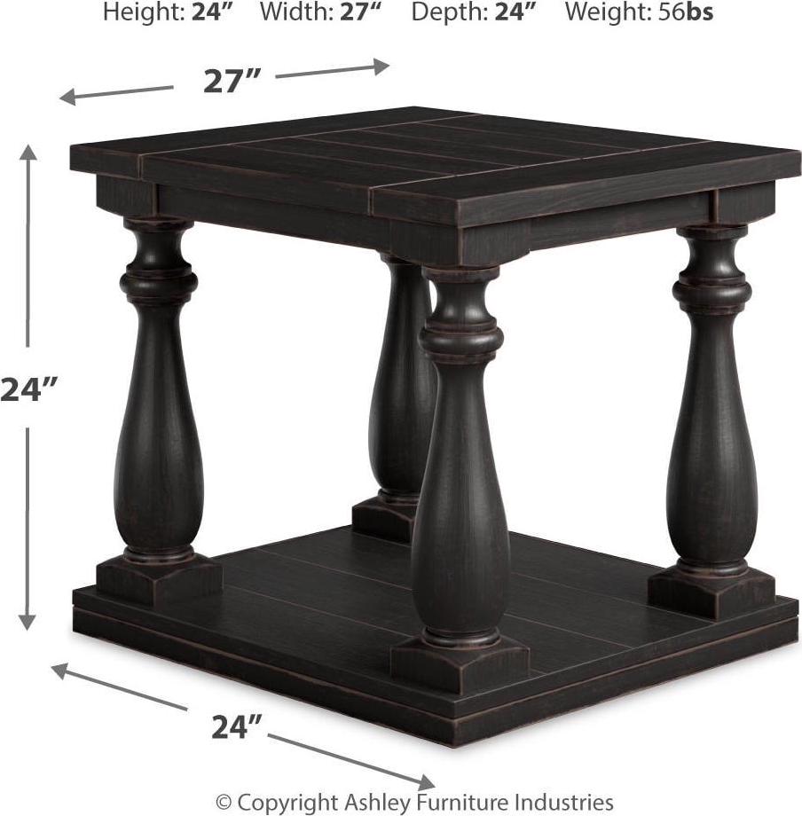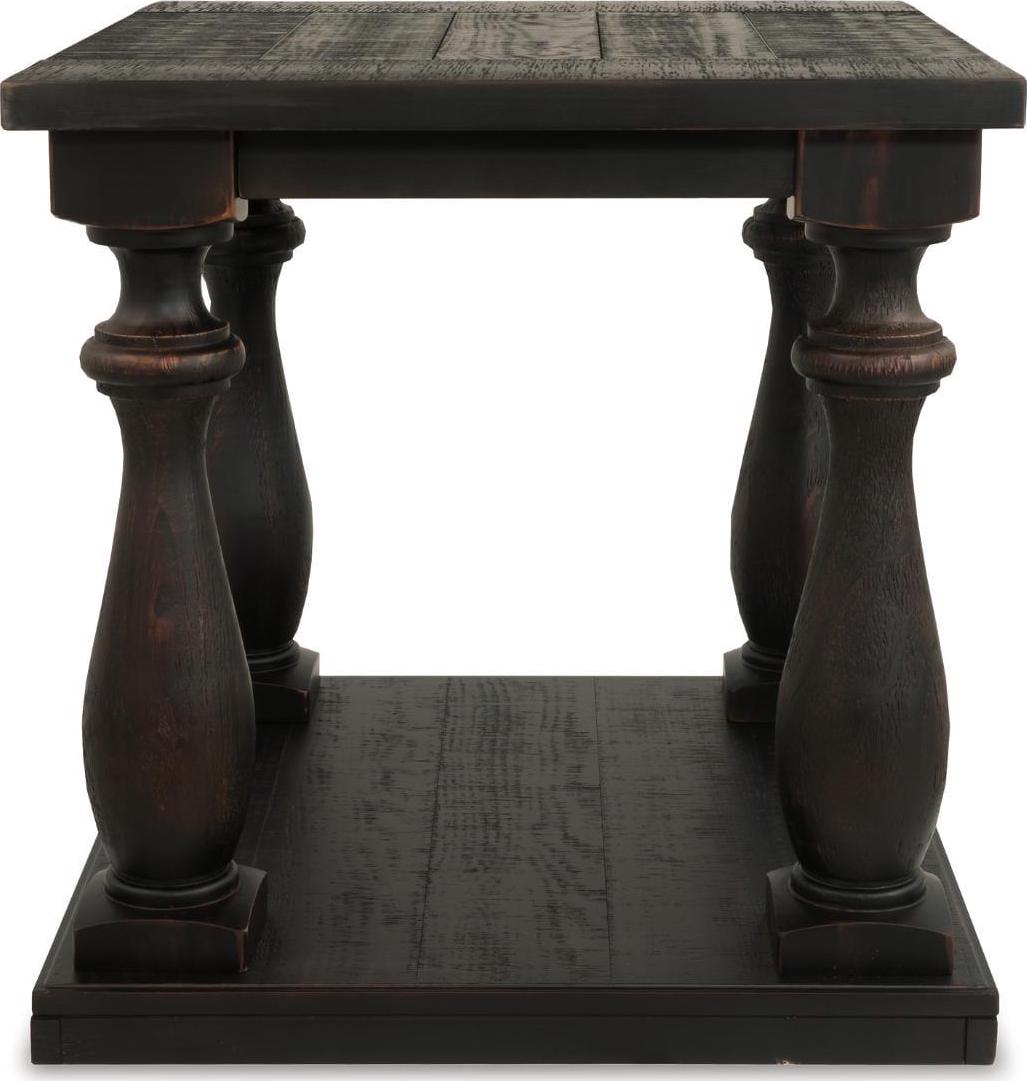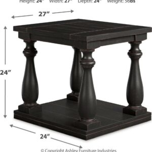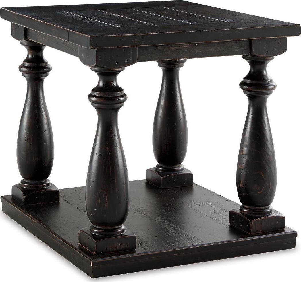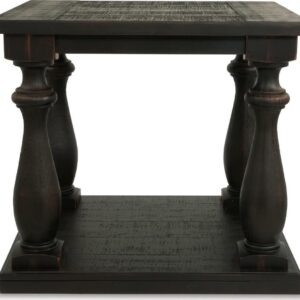 The Mallacar black end table has a dramatic presence exactly what an eclectically styled room needs. Solid wood planks and thick veneer merge seamlessly together for a hearty helping of style. Handsomely turned legs connect to a lower shelf flush with the floor. A rustic wirebrush technique gives this stunning square end table in black with show-through contrasting just enough of a weathered sensibility.