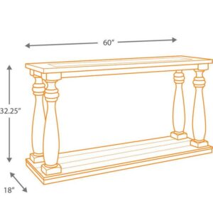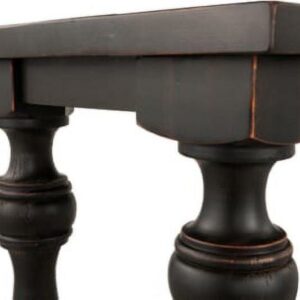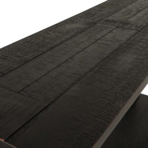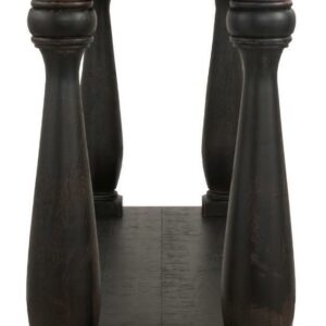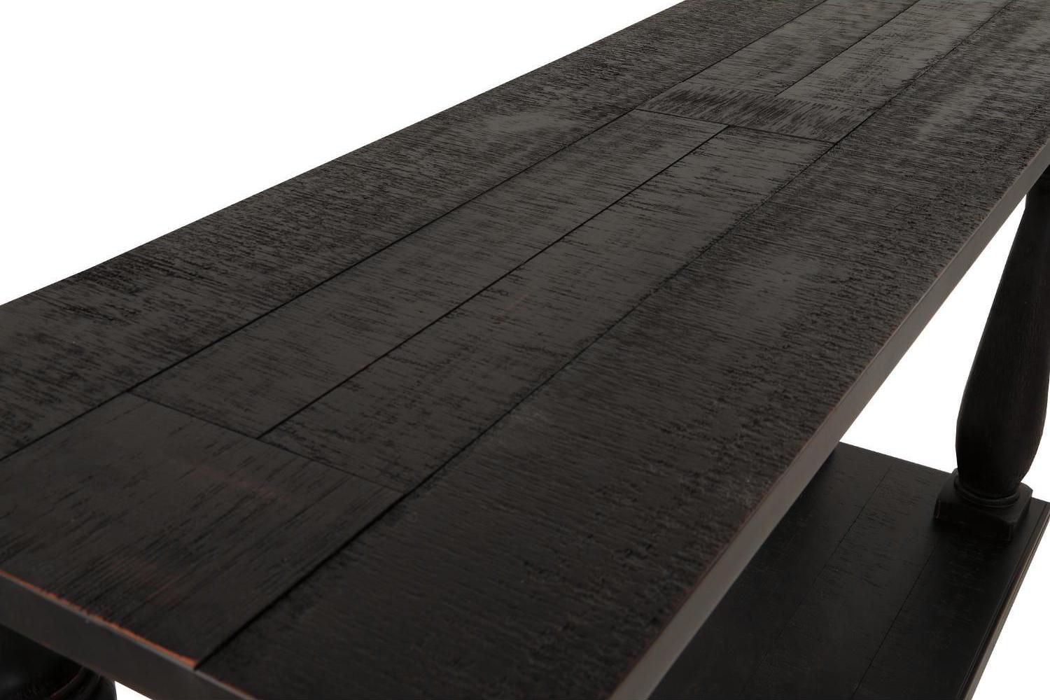 The Mallacar black sofa table has a dramatic presence exactly what an eclectically styled room needs. Solid wood planks and thick veneer merge seamlessly together for a hearty helping of style. Handsomely turned legs connect to a lower shelf flush with the floor. A rustic wirebrush technique gives this stunning sofa end table in black with show-through contrasting just enough of a weathered sensibility.