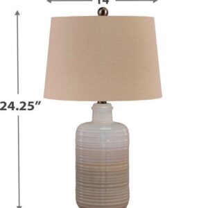 Made of white and taupe glazed ceramic with modified drum shade,3-way switch,1 type A bulb (not included); 100 watts max or CFL 23 watts max; UL Listed,Clean with a soft, dry cloth,Assembly required