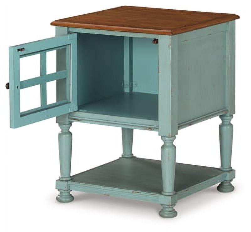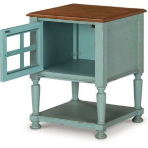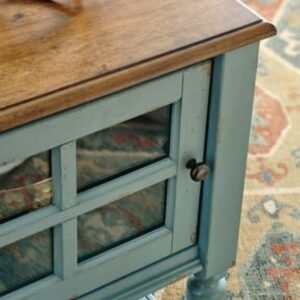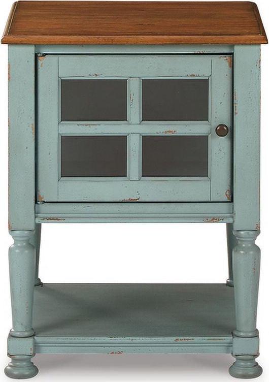 Achieve the vintage casual look you love with this Mirimyn accent cabinet. A stylish storage solution in antiqued teal and brown finishes, this accent cabinet completes any room. A lattice door front and open-air storage shelf create a layered look with endless possibilities.