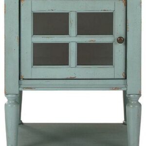 Made of wood, veneer and engineered wood,Antique teal and brown finishes,Lattice door front with inset clear glass,Metal door pull in pewter-tone finish,1 door and 1 shelf