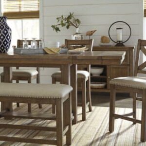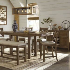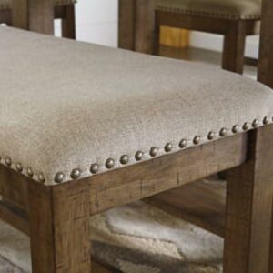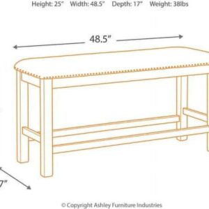 Moriville counter height upholstered bench might be simple at first sight, but a closer look reveals beauty in the details. With a distressed nutmeg finish, antiqued nailhead trim and textured polyester upholstery, Moriville is beaming with charm. Cushioned seat ensures long, lingering meals are enjoyed in total comfort.