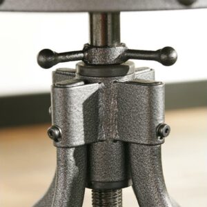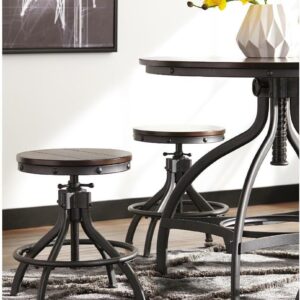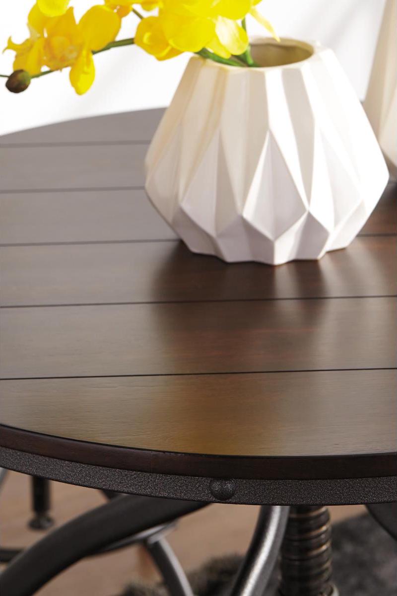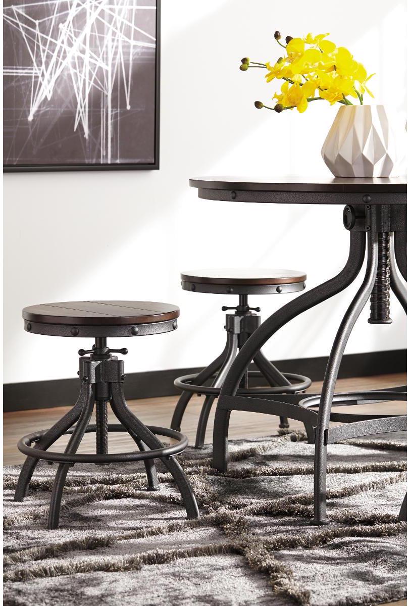 Take casual dining to new heights with the Odium counter height dining room table and bar stools. Discover how the dark bronze-tone powder coat metal finish and the planked looking top and swivel stools reflect rustic, industrial style. The table and stools are adjustable, an added bonus for accommodating everyone on game night.