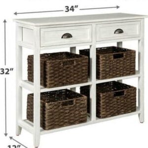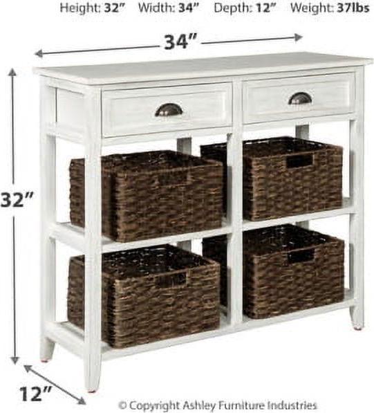 Make your modern farmhouse or cozy cottage that much quainter with the Oslember console sofa table in antiqued white. Four woven storage baskets enhance its casually cool sensibility, while cup pulls add a retro-chic touch. Whether placed in an entryway or living area, what a handy addition.