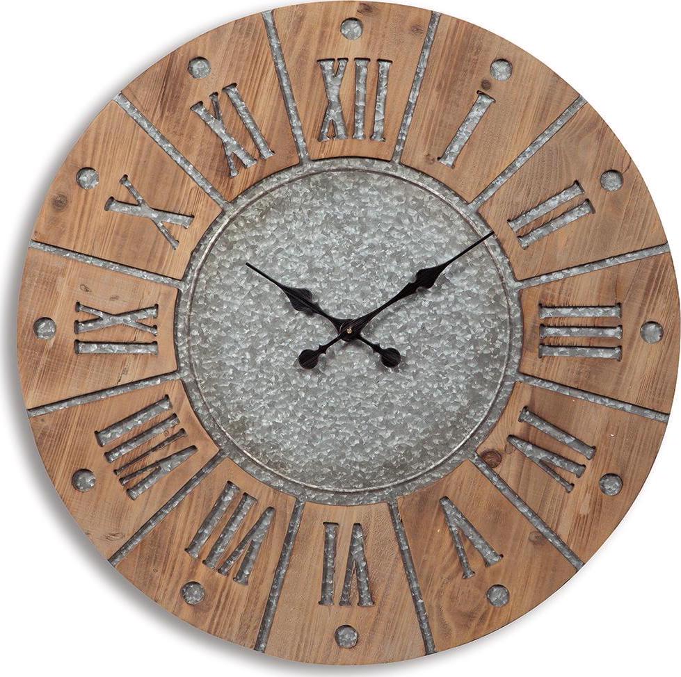 Payson wall clock is on time with industrial farmhouse style. Grain shows beautifully through the natural wood. Large Roman numerals and sun design make an impact in galvanized metal. Ample scale makes this a gorgeous focal piece for your wall.