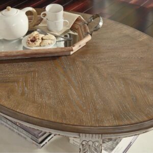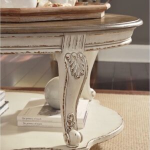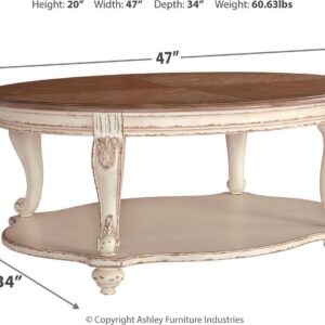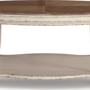 Elevating the art of traditional cottage styling, the Realyn oval coffee table is sure to serve you beautifully for years to come. Antiqued two-tone aesthetic blends a chipped white with a distressed wood finished top for added charm. Classic cabriole legs and shapely lower shelf are a lovely twist. Decorative corbels add refinement.