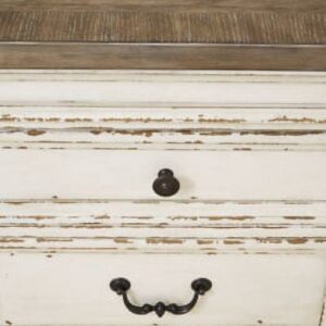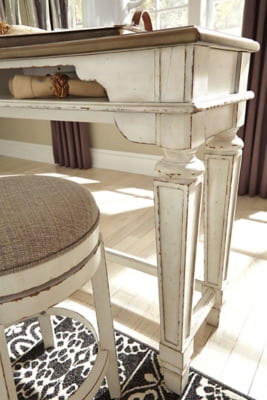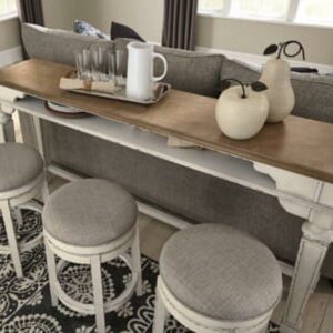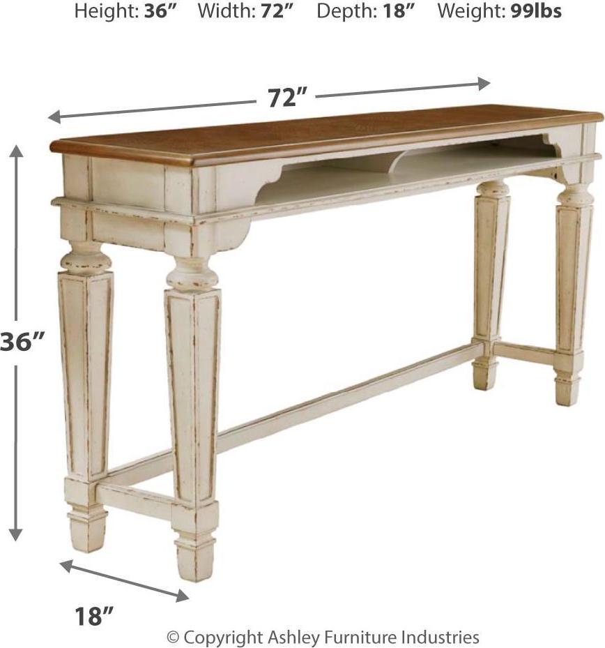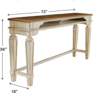 Stretch the possibilities of traditional cottage design with the Realyn long counter table. This slim, stylish table with dual open cubbies is perfectly scaled for large and small spaces alike. Place behind a sofa or sectional to enhance your entertainment area or serve up a place for casually cool dining. Its antiqued two-tone aesthetic pairs a chipped white with distressed wood finished top for twice the charm.