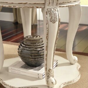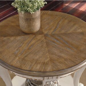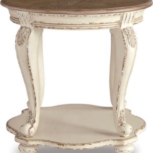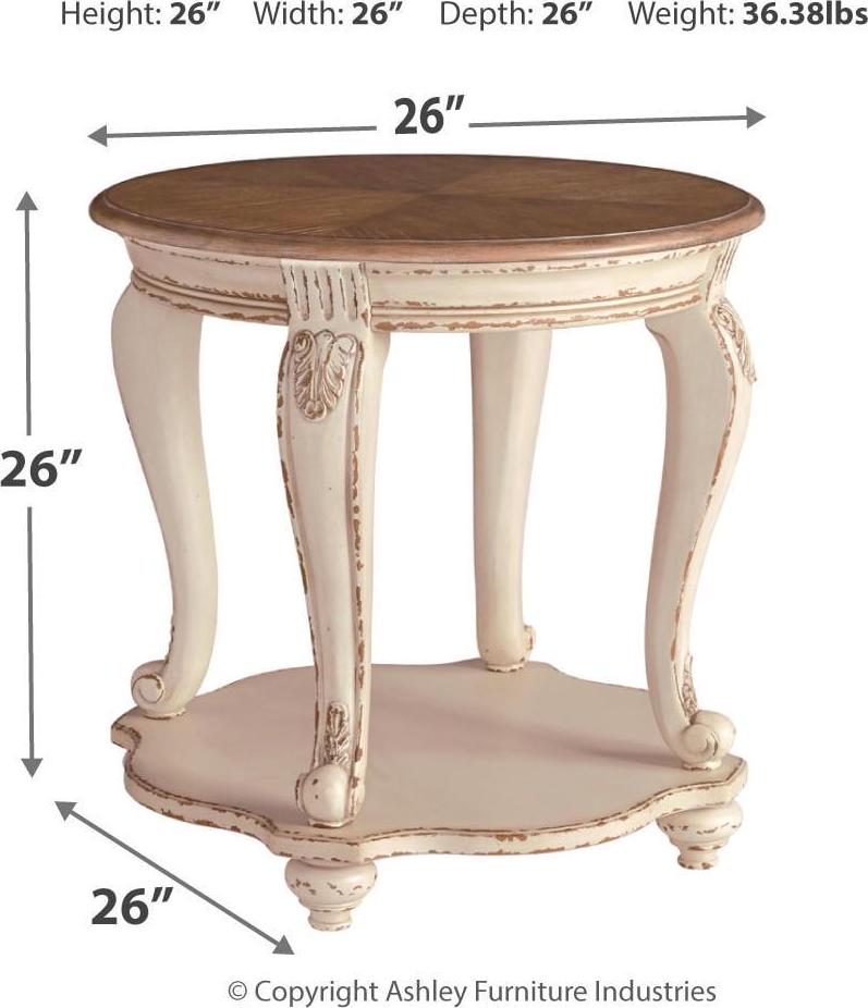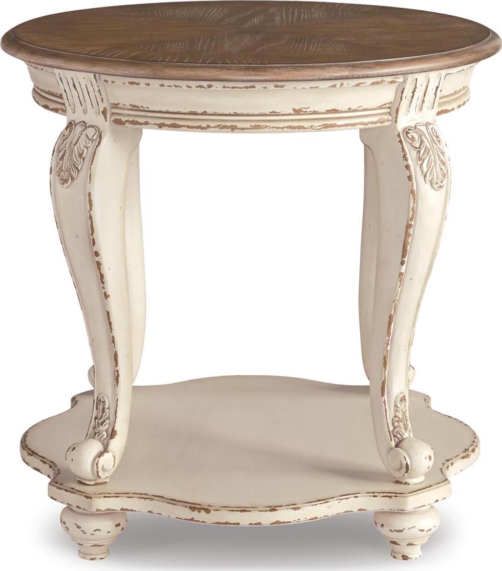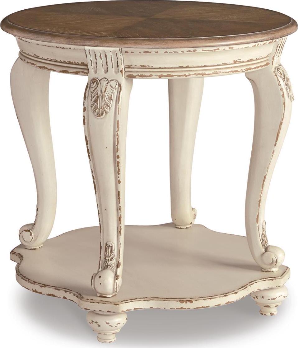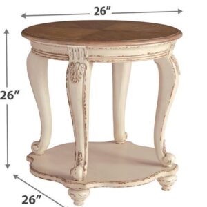Elevating the art of traditional cottage styling, the Realyn round end table is sure to serve you beautifully for years to come. Antiqued two-tone aesthetic blends a chipped white with a distressed wood finished top for added charm. Classic cabriole legs and shapely lower shelf are a lovely twist. Decorative corbels add refinement.