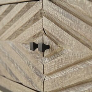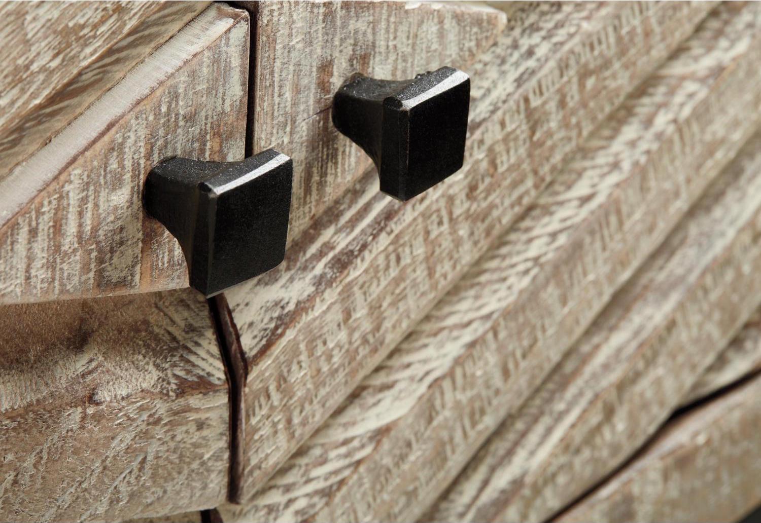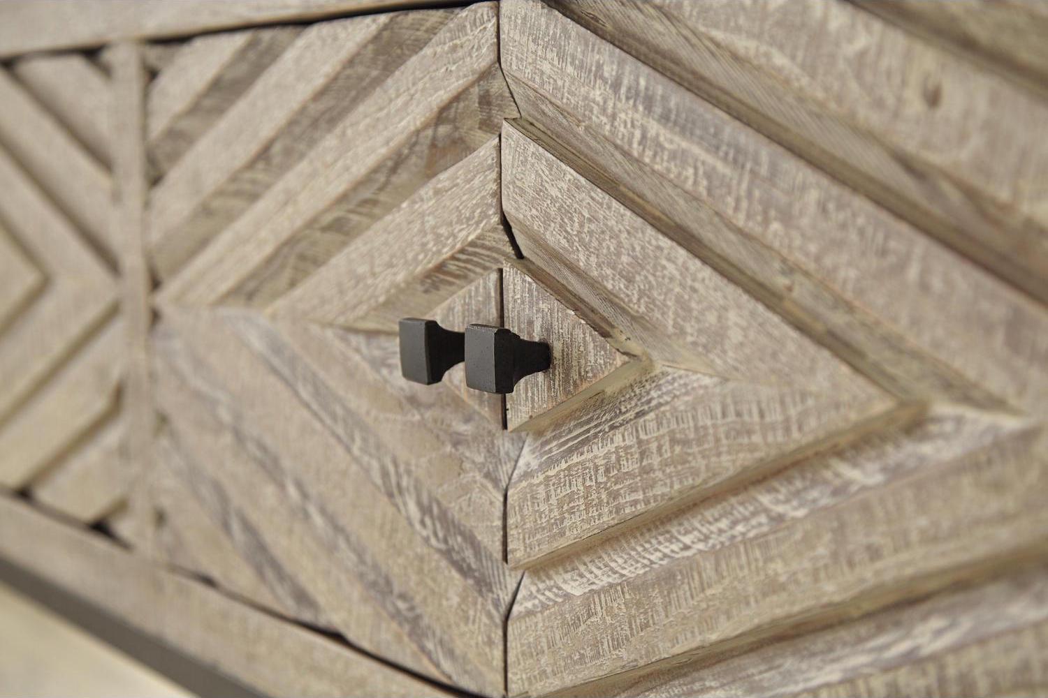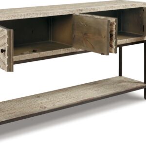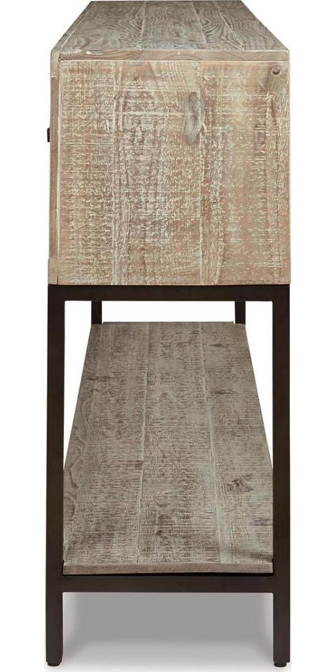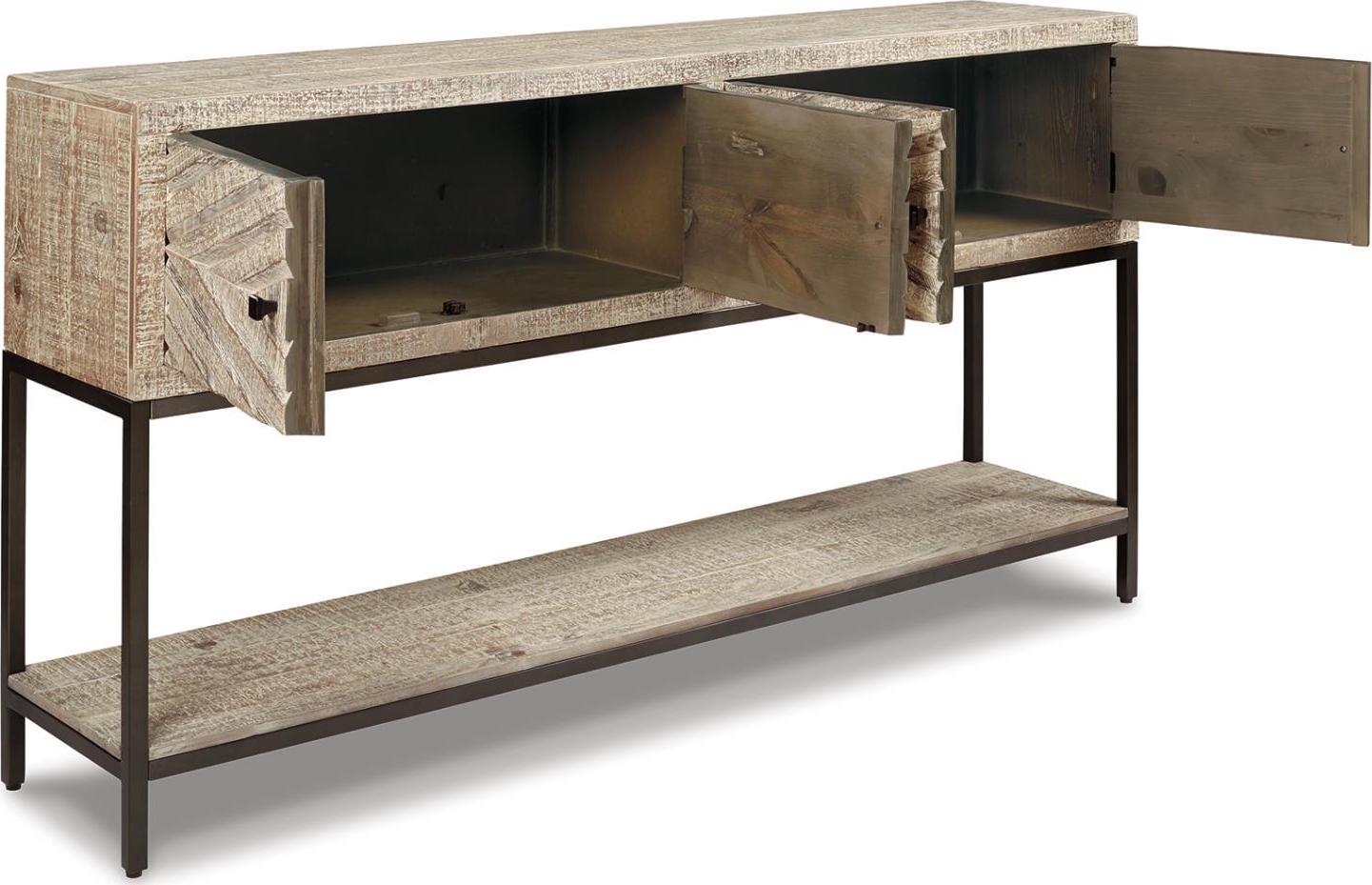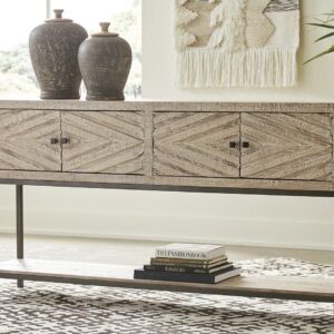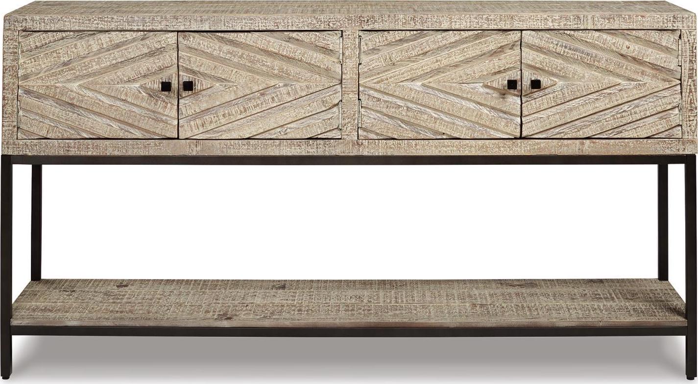 Make a cool, contemporary statement with the Roanley console sofa table. Sporting diamond-carved cabinet door fronts with great dimension, this designer piece is an inspired choice for an entryway, dining room or living space. Combination of distressed white wood and black metal is so striking.