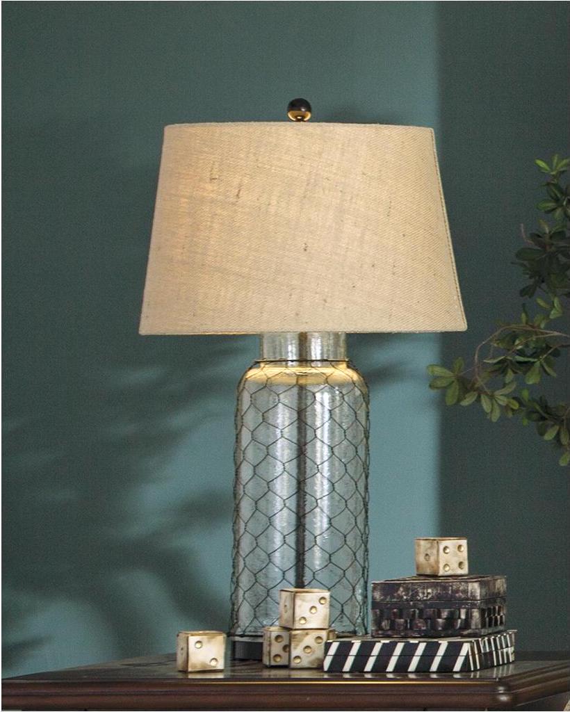 Lamp base made of clear glass with wire metal detail,Versatile style easily complements coastal chic, modern farmhouse and vintage-inspired spaces,Modified drum shade with beige fabric and naturally beautiful linen-weave texture,3-way switch makes this lamp a smart choice for task lighting,1 type A bulb (not included); 150 watts max or CFL 25 watts max; UL Listed