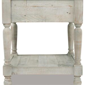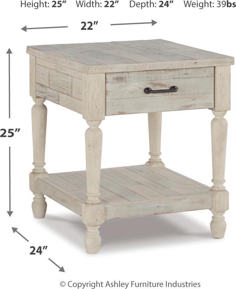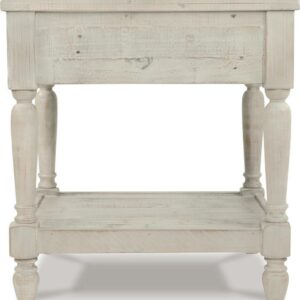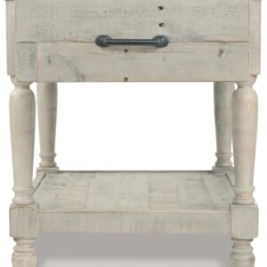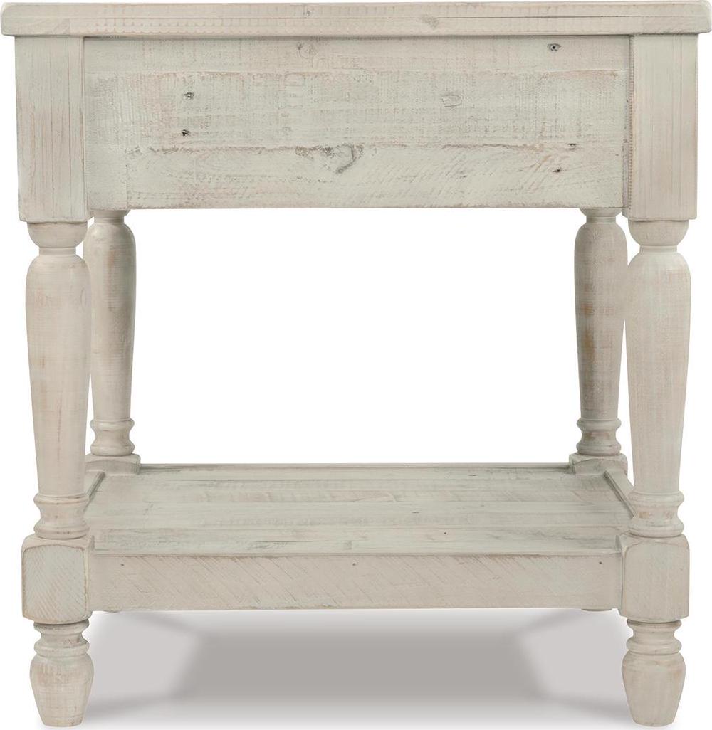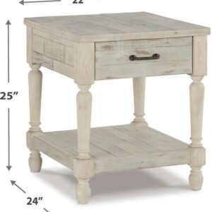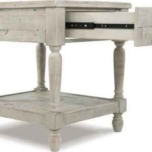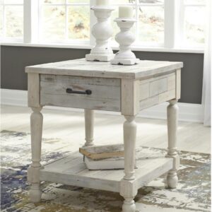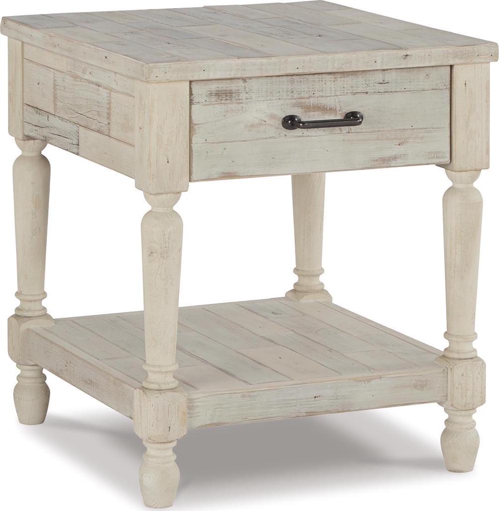 Inspired pieces create inspired spaces. The Shawnalore rectangular end table charms your home with farmhouse style. White textural finish highlights the weatherworn feel of the wood tones and purposeful nail holes. Roomy drawer puts essentials out of sight. Display fashionable books or decor on the planked tabletop and bottom shelf.