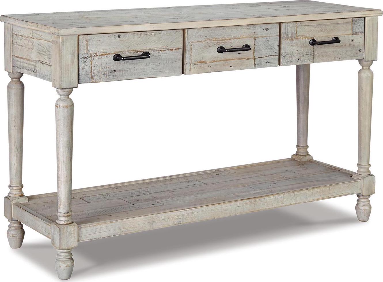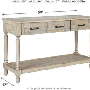 With its distinctive whitewash finish, plank-effect styling and distressed touches that lend a reclaimed sensibility, the Shawnalore sofa table serves up a delightful twist on farmhouse style. Crafted with solid pine wood, this sofa table sports three storage drawers and underlying shelf for that much more character.