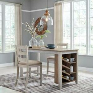 The Skempton counter height table with storage invites you to raise the bar on small space living. An inspired choice for coastal chic or modern farmhouse settings, this clean-lined, simply striking table doubles the charm with a brown tone top with plank effect, paired with a grayish white base with rub through effect for timeworn appeal. Built-in 8-bottle wine rack and pair of open shelves make the most of every inch of space.