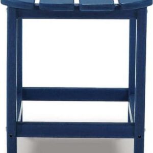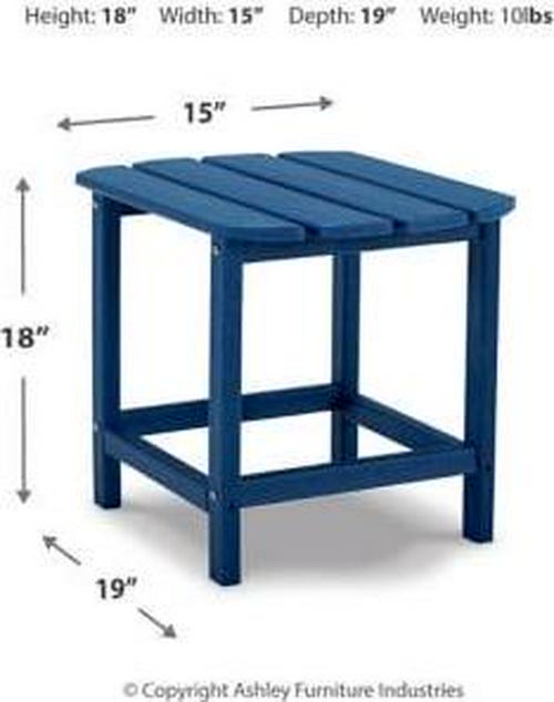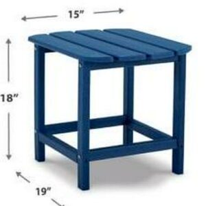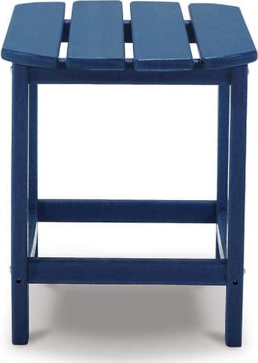 Add cottage-quaint charm to your outdoor oasis with the Sundown Treasure outdoor end table in blue. Made of our MEGA TUFF high-density polyethylene material, it s sure to weather the seasons beautifully. Designed to shed rainwater, the table s slatted top with gently rounded corners provides exceptional form and function.