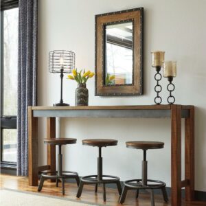 Make your home the hub for cool vibes with the Torjin long counter table. Two-tone finish scheme of distressed warm brown and aged gunmetal is full of urban industrial swagger. Long length makes it suitable for 3 people to sit. Add it behind your sofa with the Torjin stools for a dapper eating or working space.
