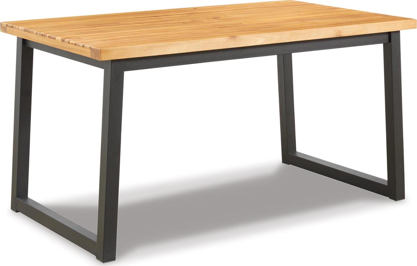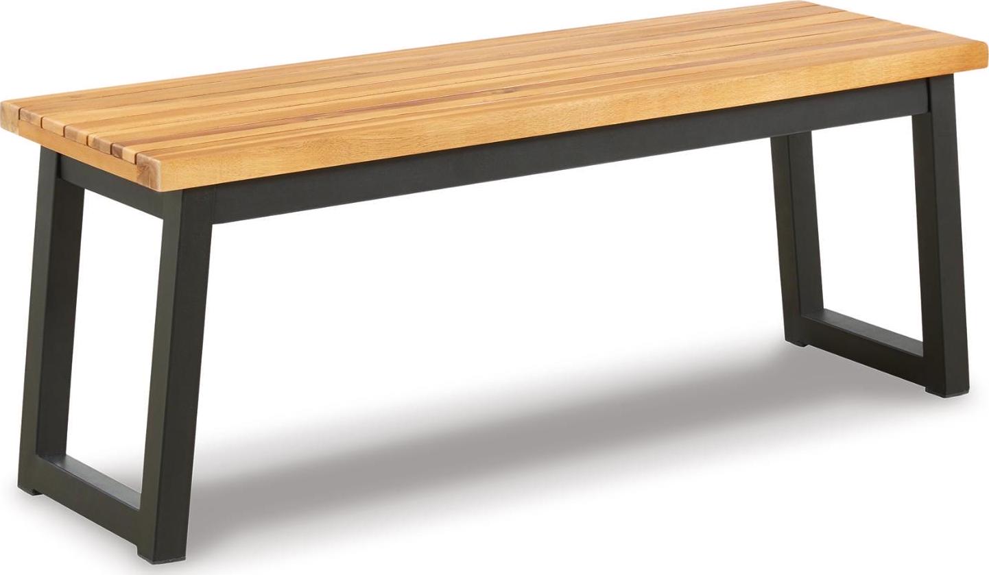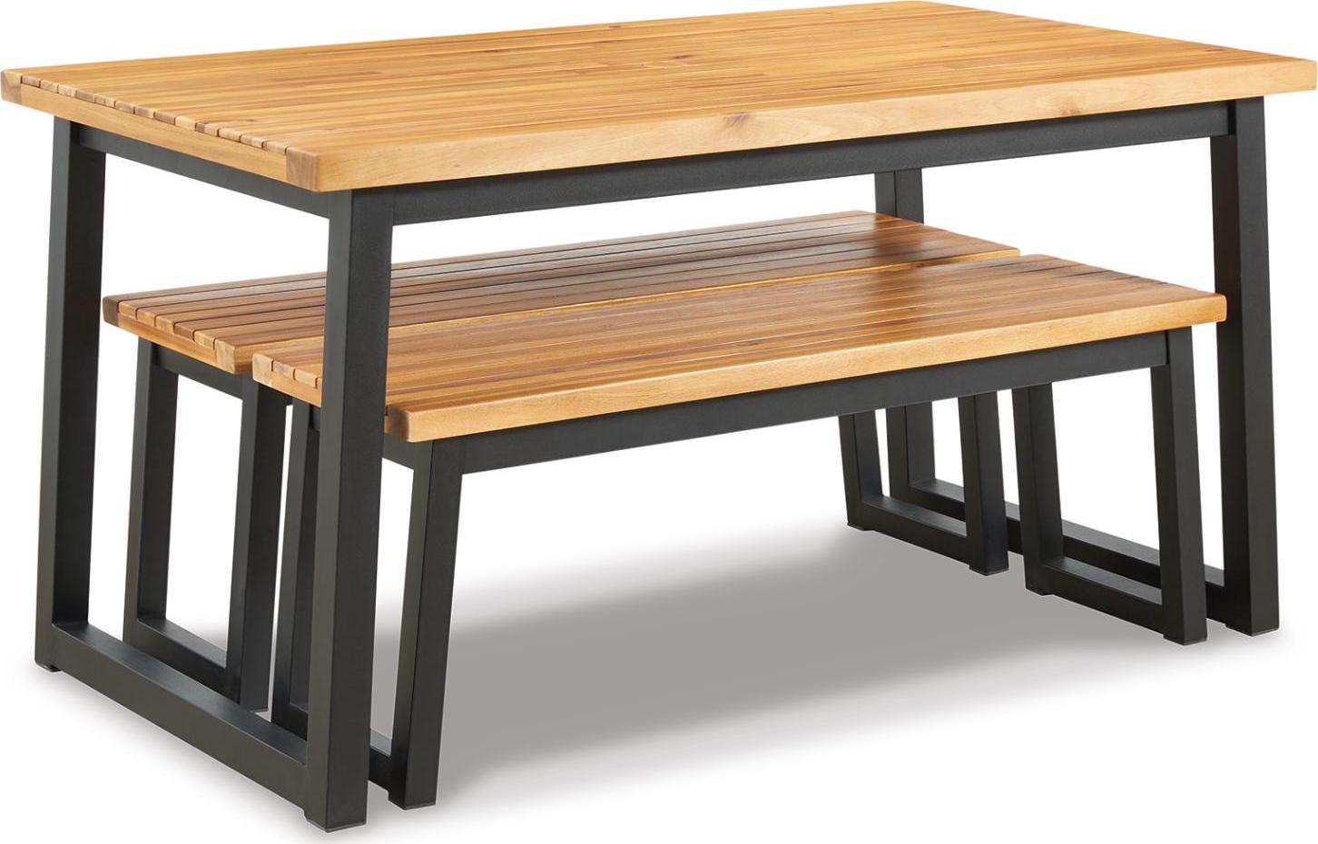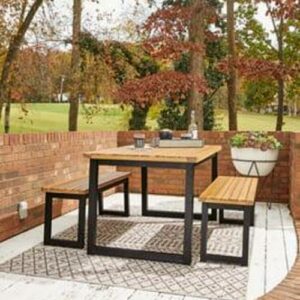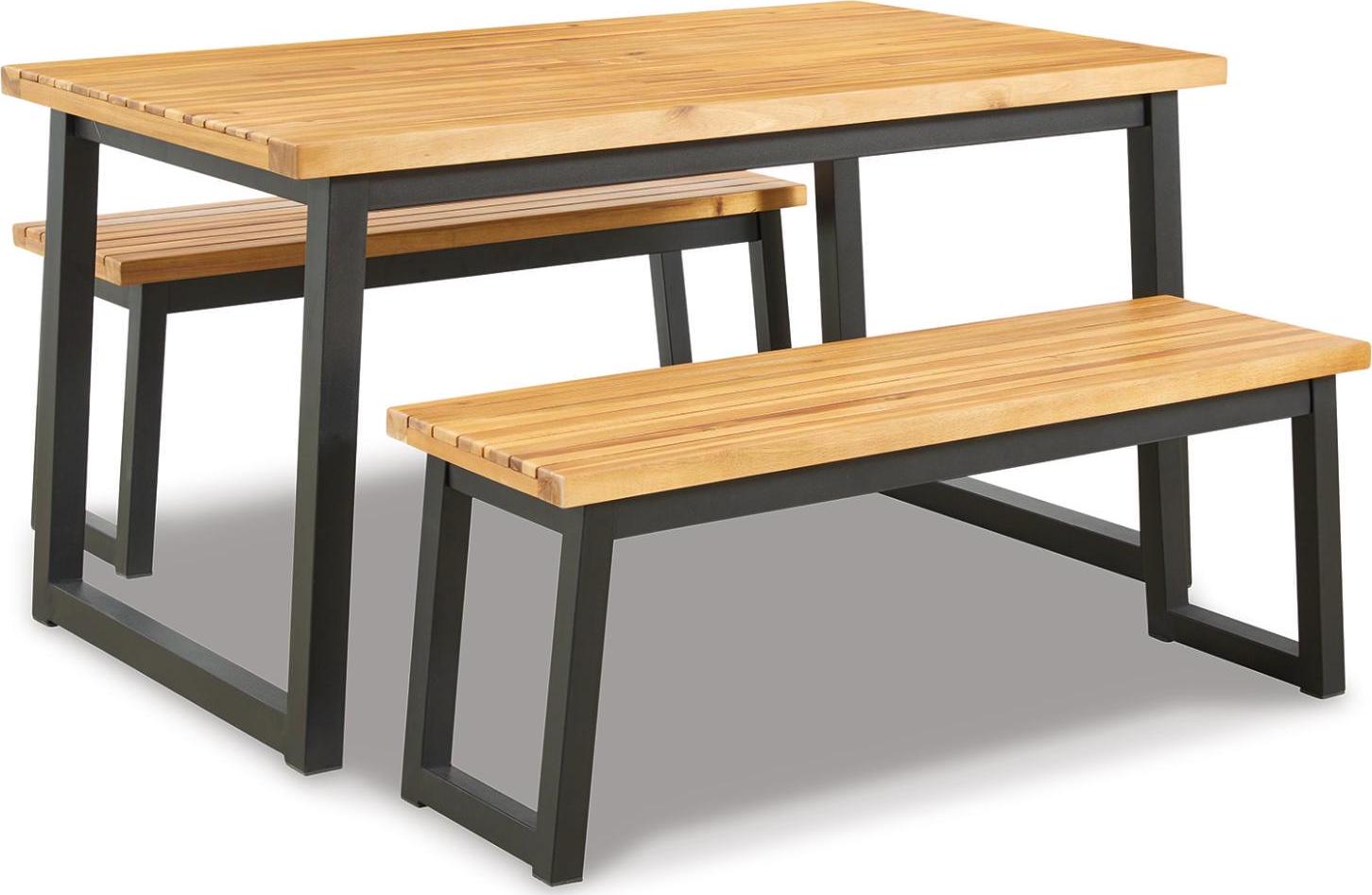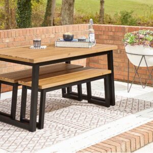 3-piece outdoor furniture set includes dining table and 2 benches,Tabletop and seats made of acacia wood,Table includes umbrella hole,Steel legs/table base in black powder coated finish,Seats 4