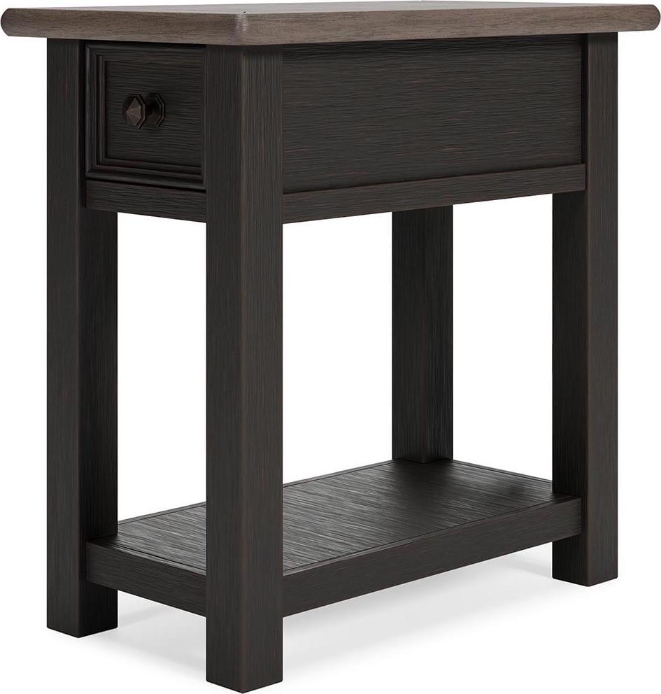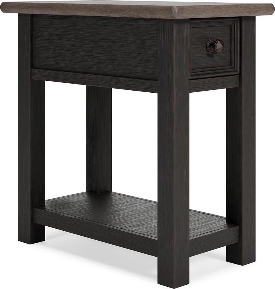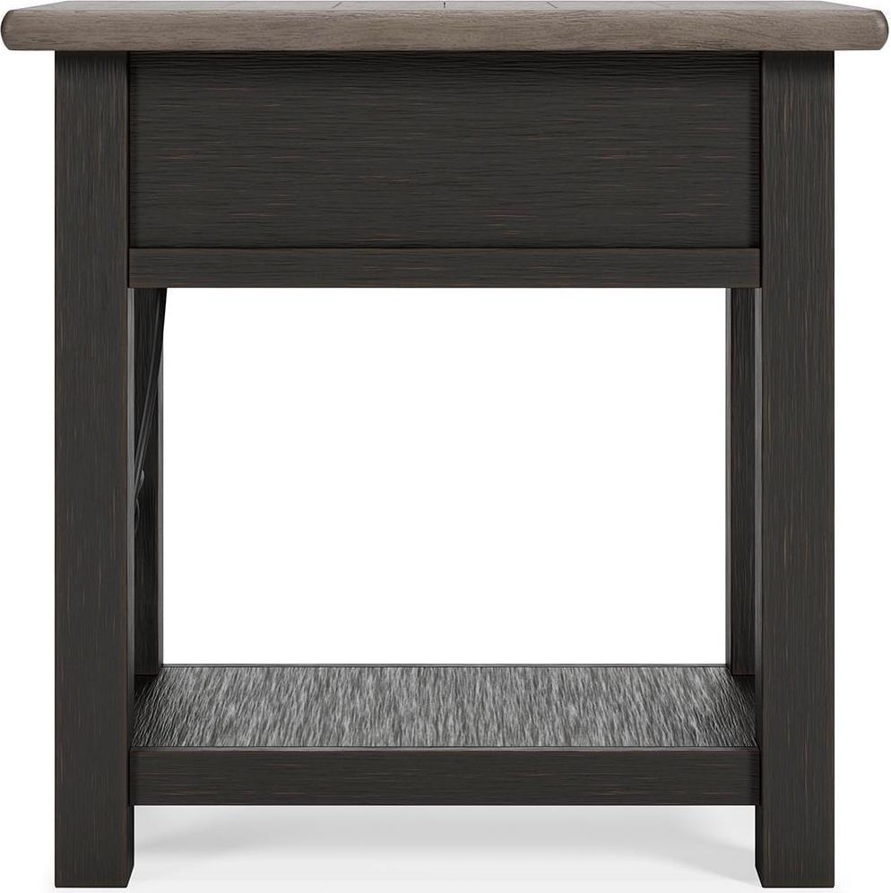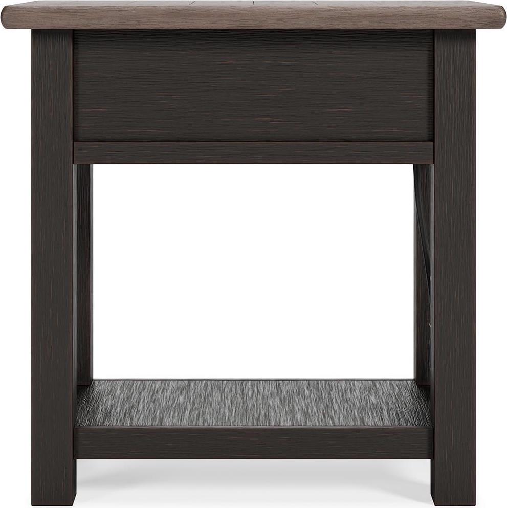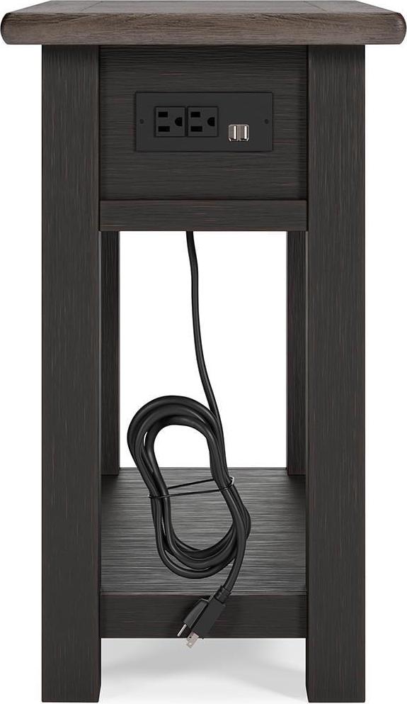 Quality crafted and richly styled, the Tyler Creek rectangular chairside end table is sure to charm. Two-tone aesthetic pairs a weathered grayish brown tabletop with a textured wire brushed base in black with rub-through effect. Built-in shelf offers handy display space. Integrated 110V power supply with dual USB charging ports makes it so easy to your personal devices powered up.
