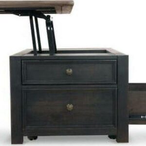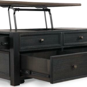 Shabby chic with a hint of down home country. The Tyler Creek lift top coffee table with textured black finish is all the talk of today s design world. Wood grain shows through the weathered gray-brown top in all of its earthy pleasure. Framed drawers are adorned with lovely traditional hardware. Smooth-gliding drawers make it easy for you to store away your belongings in style. Lift top transforms your space into a workstation without a hitch.