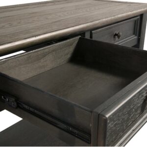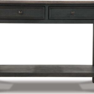 Shabby chic with a hint of down home country. The Tyler Creek sofa table with textured black finish is all the talk of today s design world. Wood grain shows through the weathered gray-brown top in all of its earthy pleasure. Framed drawers are adorned with lovely traditional hardware. Smooth-gliding drawers make it easy for you to store away your belongings in style.