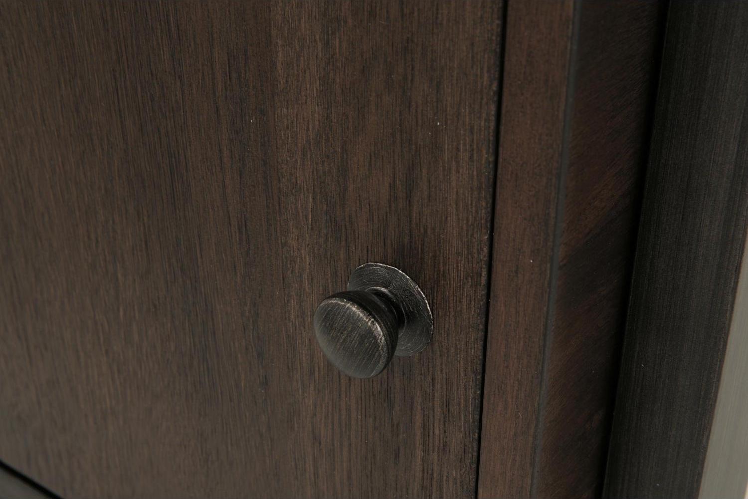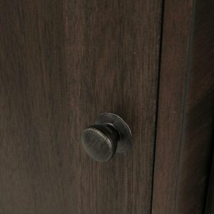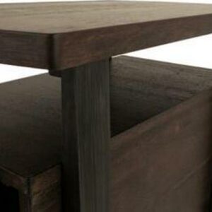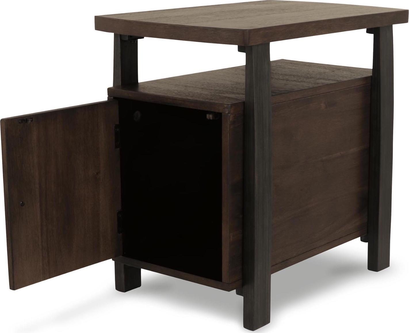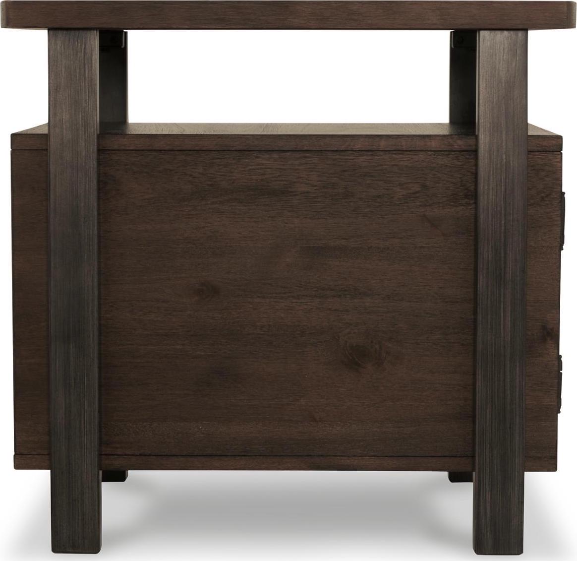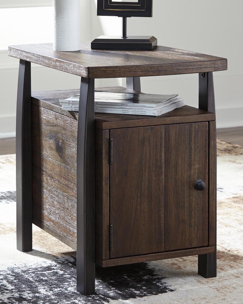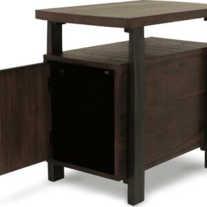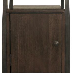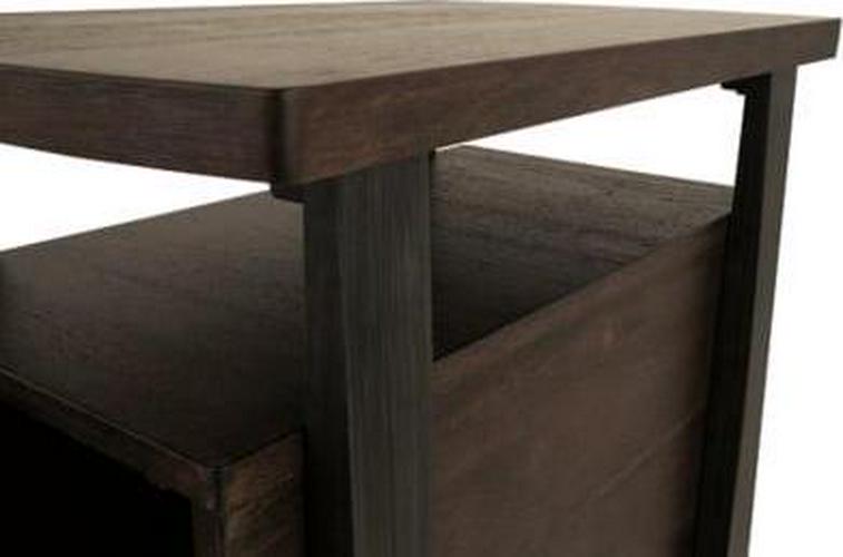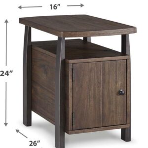 Form, function and a whole lot of style is what the Valibry chairside end table is all about. Its deep cabinet, open upper shelf and top offer lots of convenient spots to keep chairside necessities. The distressed brown finish contrasts beautifully with the dark brown faux metal finished legs for a floating top look that’s striking. The magazine rack on the back of the table is an added bonus for keeping periodicals within reach, but out of sight quite a value for a look that will withstand the test of time.