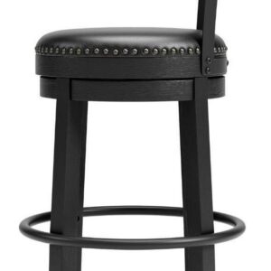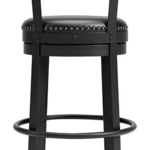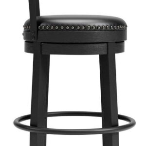 Bring a dash of drama to a kitchen island, table or counter with the Valebeck upholstered swivel bar stool. The sturdy wood frame with contoured backrest is beautified with an antiqued black finish that s a welcome change from the everyday ordinary. For your comfort and convenience, the bar stool seat is covered in a durable black faux leather designed for easy cleanup. Nailhead trim and metal accents perfect the aesthetic of this head-turning bar stool with 360-degree swivel.