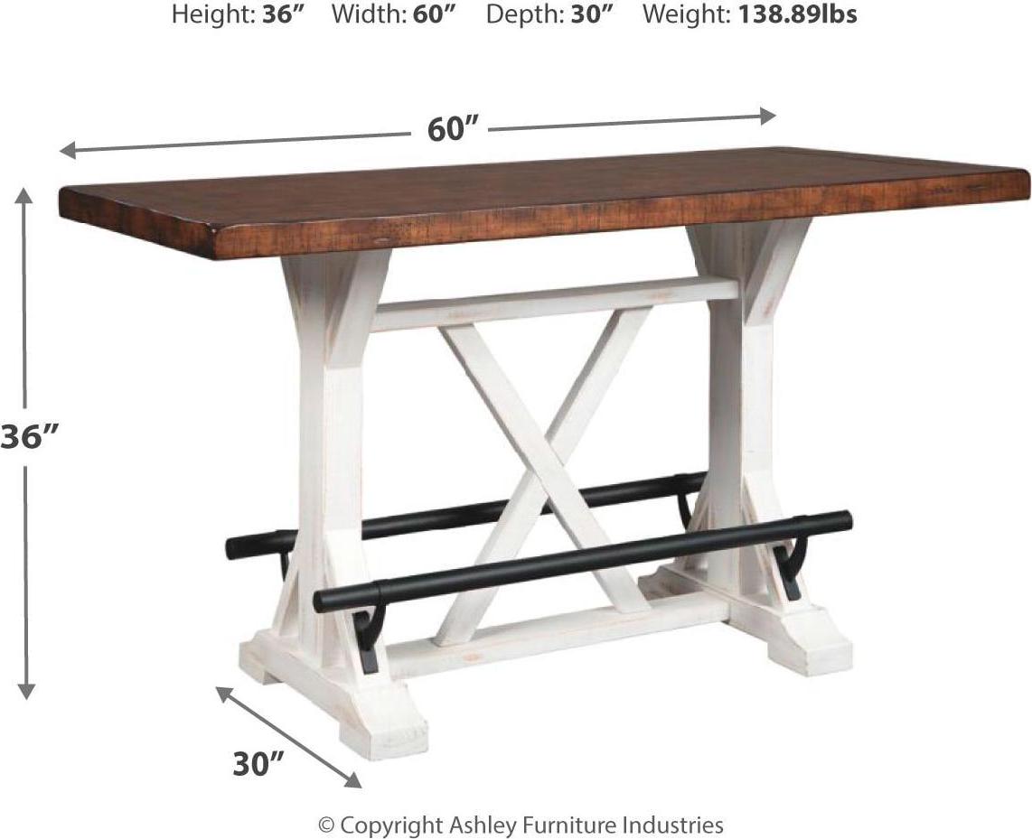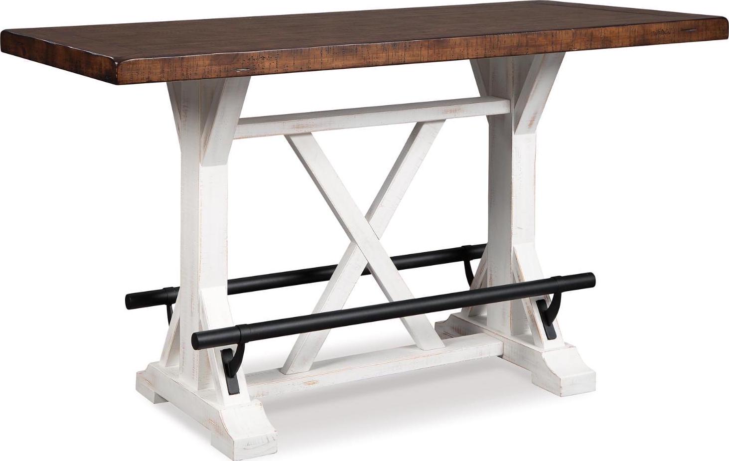 A high-style choice for smaller spaces, the Valebeck counter height dining table serves up the best in rustic farmhouse living. Two-tone finish pairs a brown tabletop with a distressed vintage white base for a double helping of charm. Black metal foot rests add such a distinctive twist.