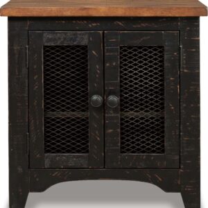 To those with an eye for the best in rustic farmhouse living, the two-tone Valebeck end table doubles up on charm. Designer touches include plank-effect styling, distress marks and wire mesh door fronts for added character.