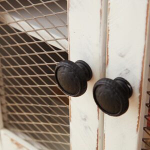 Made of veneers, wood and engineered wood,Distressed finish; vintage white and aged natural pine color,Double door cabinet with metal grills and hardware,Center shelf,Assembly required