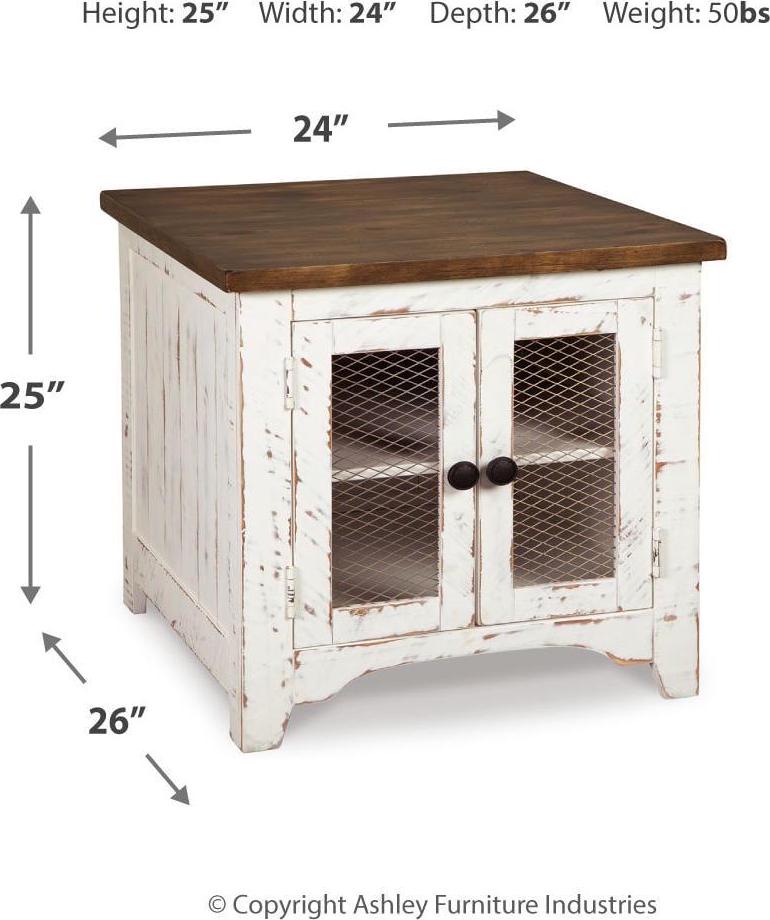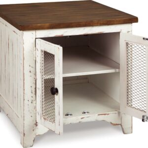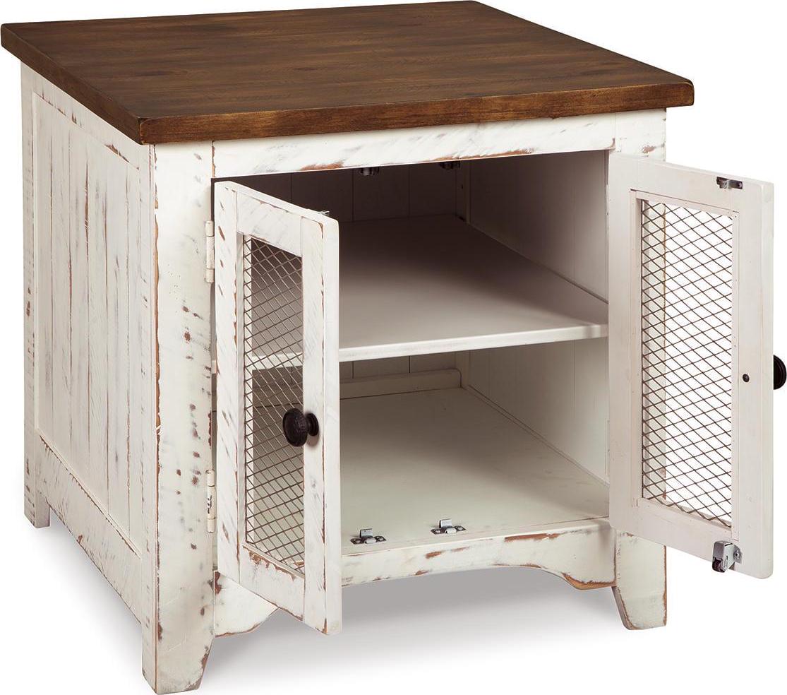 Double take. Sporting a two-tone finish that pairs a distressed vintage white with aged natural pine color, the Wystfield end table elevates the art of rustic farmhouse living. Enhancing its charm: shelved storage visible through cabinet doors with inset metal grills.
