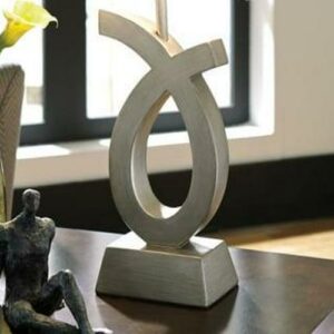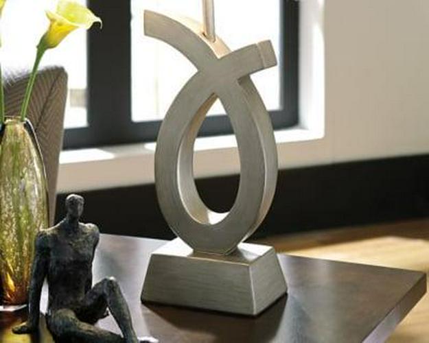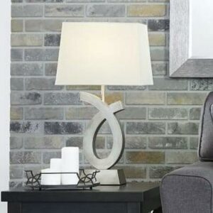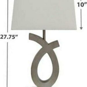 The Amateya table lamp is an intriguing combination of hard lines and soft curves. Part lamp. Part art sculpture. Totally stunning. Inspired by twisted metal, the open-concept base is crafted of resin and finished in a soothing silver for upscale flair.